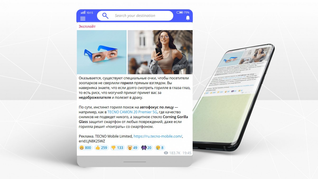 В качестве площадок для размещения были выбраны Телеграм-каналы, чья аудитория ценит оригинальный контент, использует каналы как источник новых, необычных, смешных фактов, или приходит туда в поиске лайфхаков и полезных советов. Мы проанализировали характерный для этих каналов контент и разработали отдельные креативы специально для каждой из площадок.