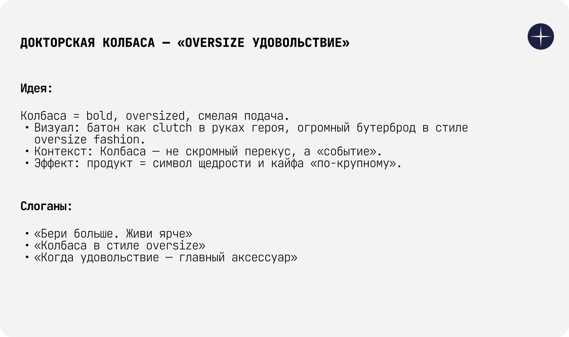 Разработали три креативные территории («На стиле», «Сыто/Только фреш», «Oversize удовольствие»). Выбрали доминирующую и оформили Key Visual с силой продукта как «аксессуара» стиля.