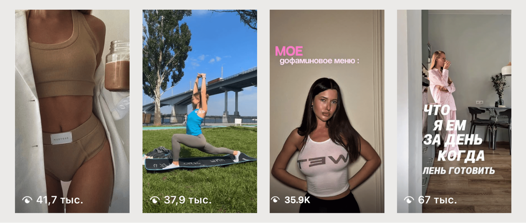 короткие динамичные видео со сменой кадров (рутина/спорт/уход за собой) — играют на вовлечение и вызывают интерес аудитории, порой вдохновляют, поэтому находят большой отклик у аудитории.