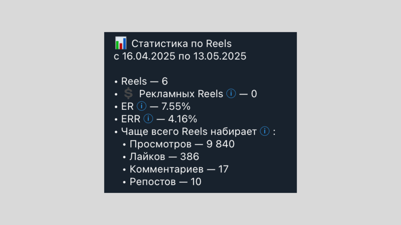 соотношение подписчиков и охватов на роликах: средние охваты должны превышать количество подписчиков и быть стабильными. Так будет легче понять, какие минимальные просмотры сможете получить и не уйти в минус.