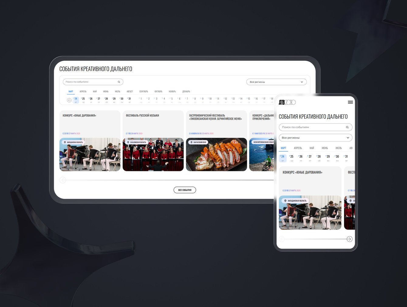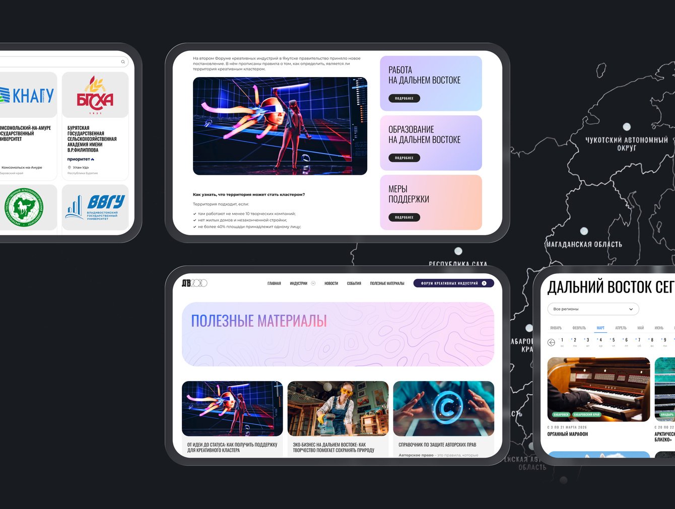 При разработке платформы мы сделали акцент на главной идее проекта: Дальний Восток — это территория идей, где создаются новые культурные смыслы и возможности для бизнеса. Эту мысль мы раскрыли в дизайне, навигации и ключевых функциональных решениях креативныйдальний.рф.