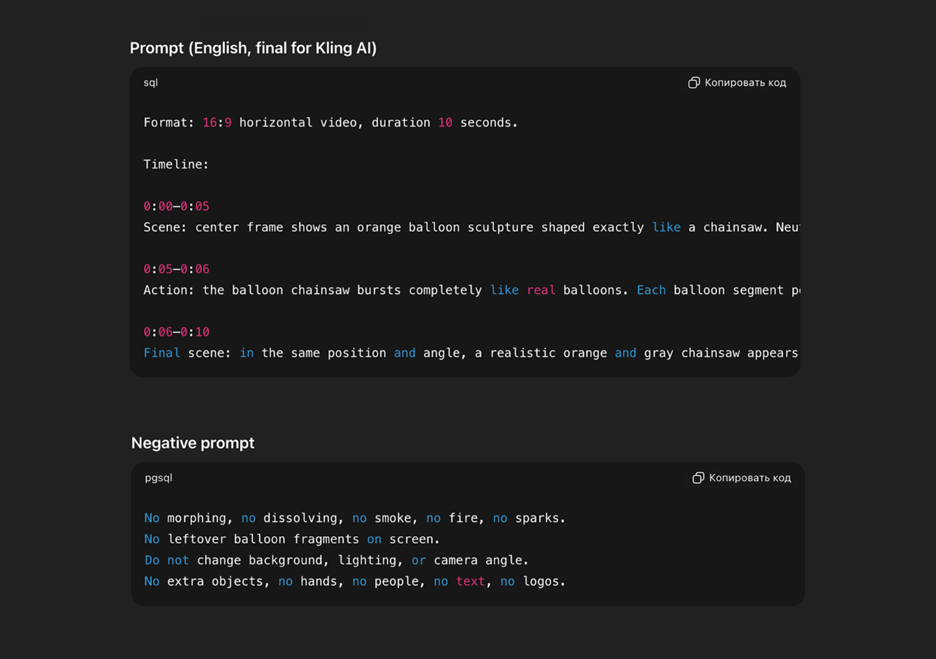 Задачи для нейросети KlingAI мы изначально прорабатывали в ChatGPT. Именно здесь мы детально формулировали позитивные и негативные промпты, чтобы минимизировать ошибки и добиться максимально чистого результата.