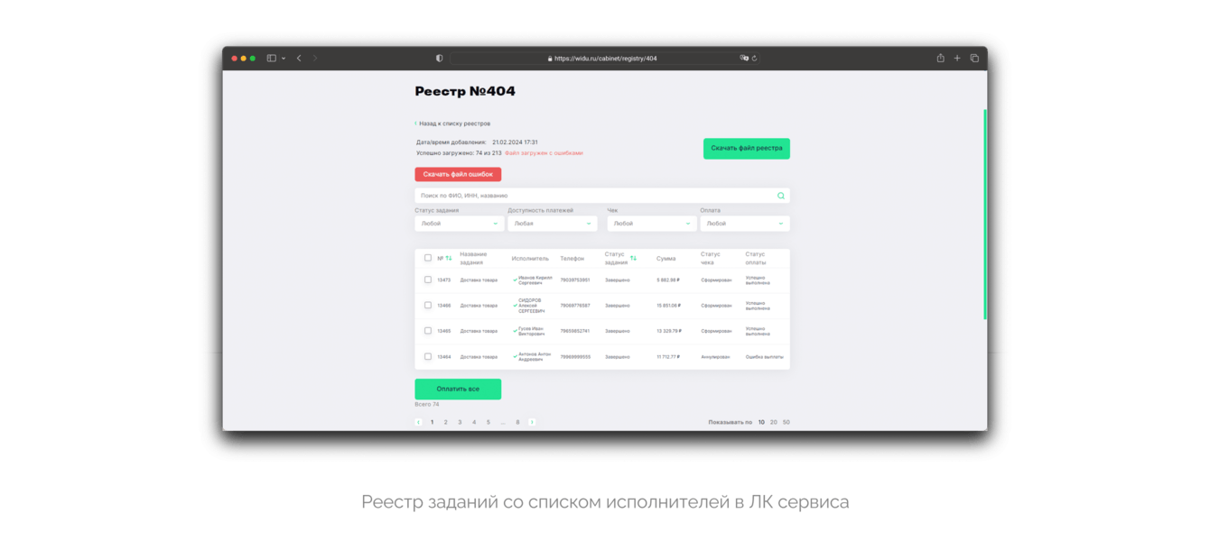О функциональности реестра заданий мы уже писали выше. Крупные заказчики «не мелочатся», если им нужно нанять три тысячи курьеров, то должен быть инструмент, которые позволяет удобно работать с большими данными. Возможность опубликовать задания и получить чеки с помощью одной кнопки — мастхэв в такой ситуации.