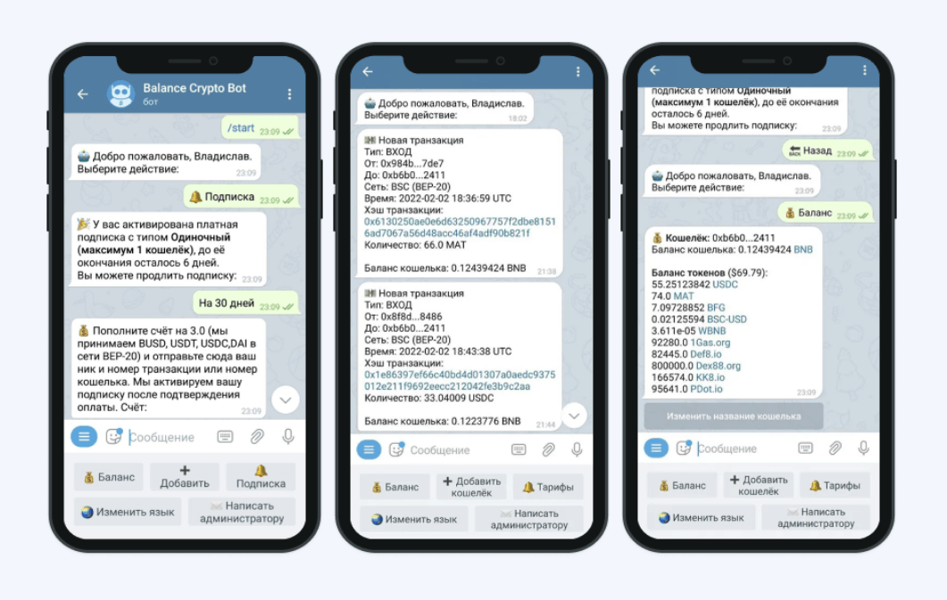 Главная задача, которую нам предстояло решить, это реализовать грамотный парсинг информации из дочерних ресурсов (их всего было 15). На сайте все транзакции шли в динамическом режиме. Поэтому чтобы бот мог оперативно присылать уведомления, мы настроили автоматический парсинг сайтов через каждые несколько секунд. Это позволило мгновенно присылать сообщение о любой активности на кошельке.