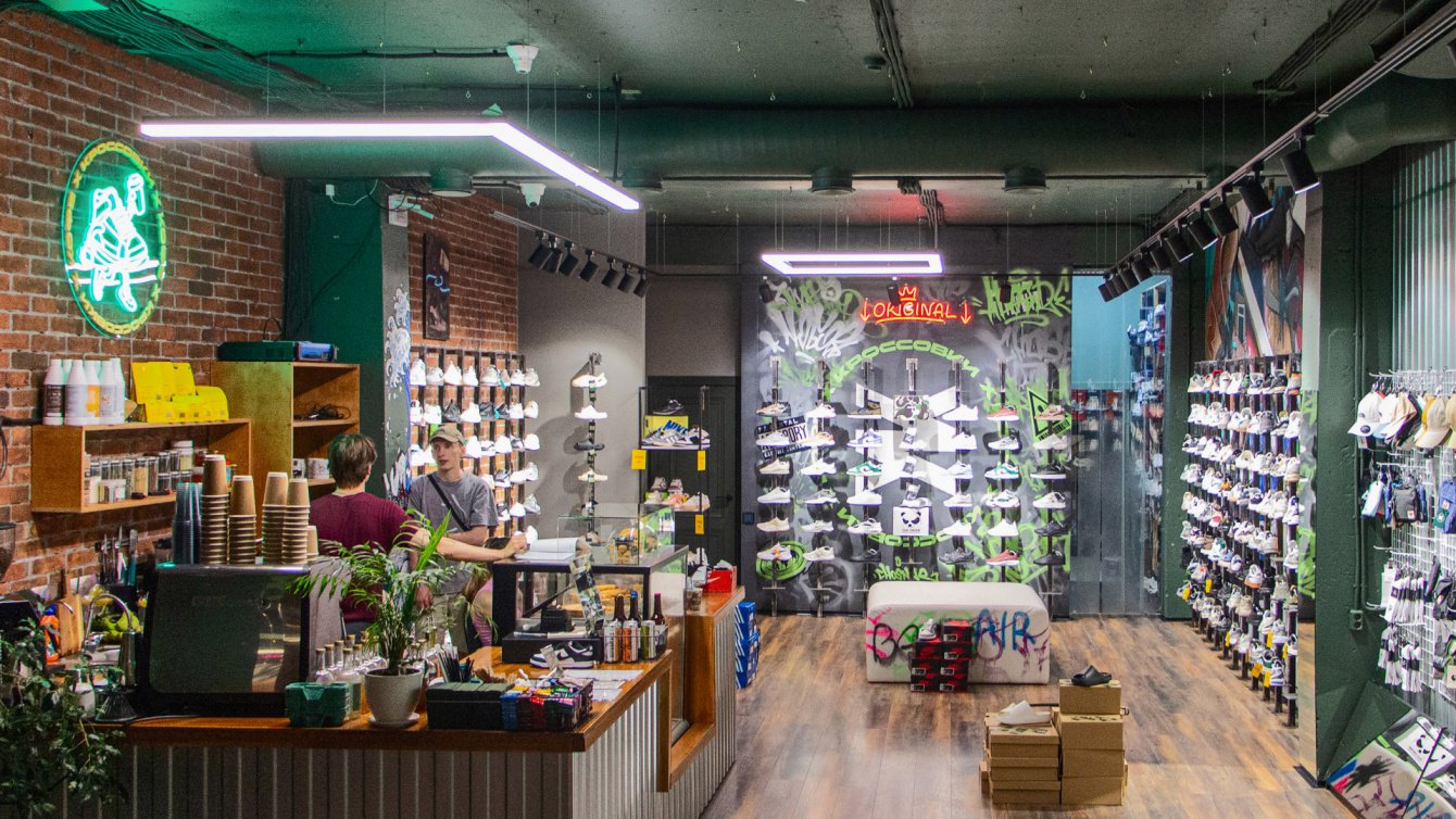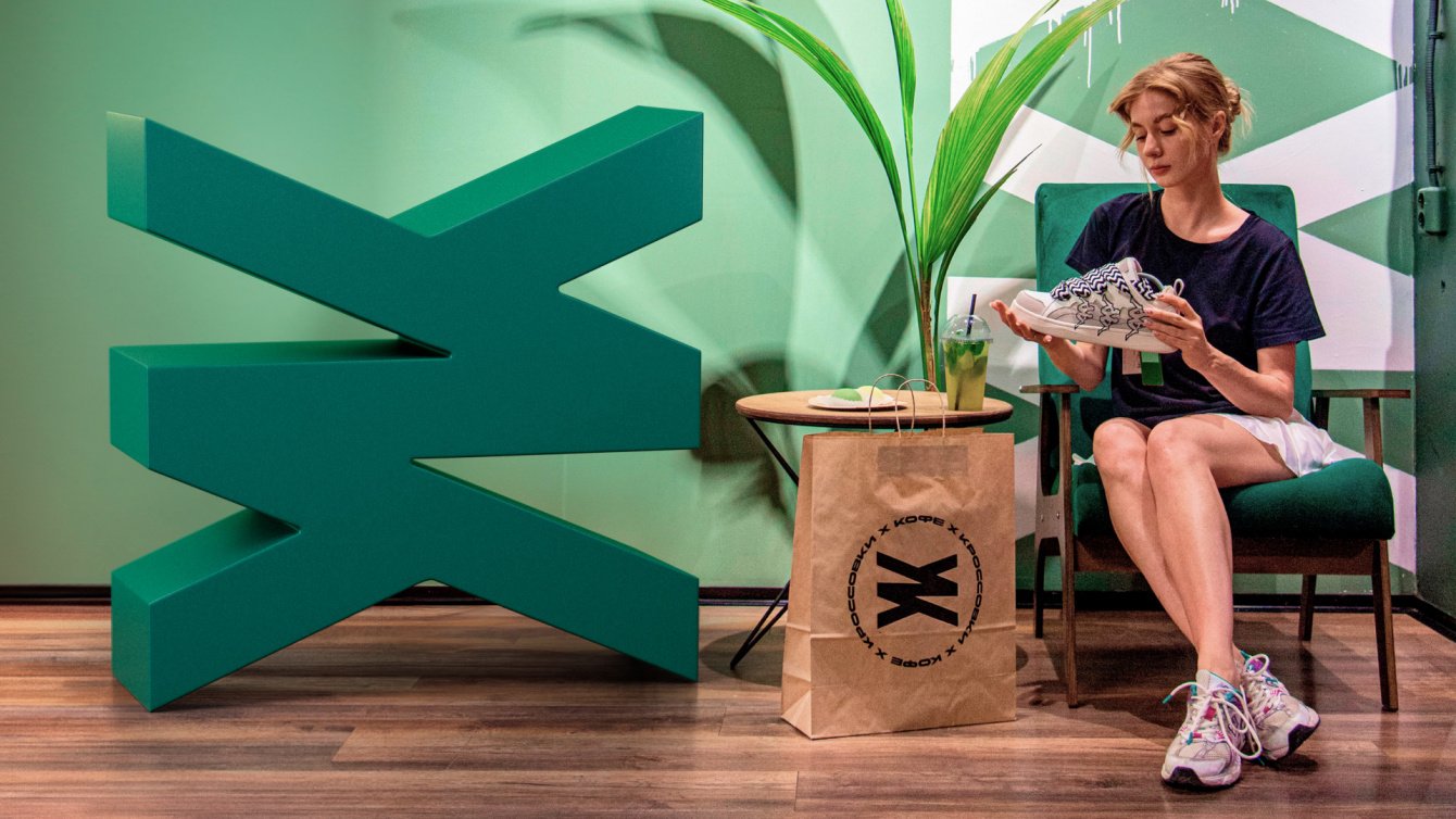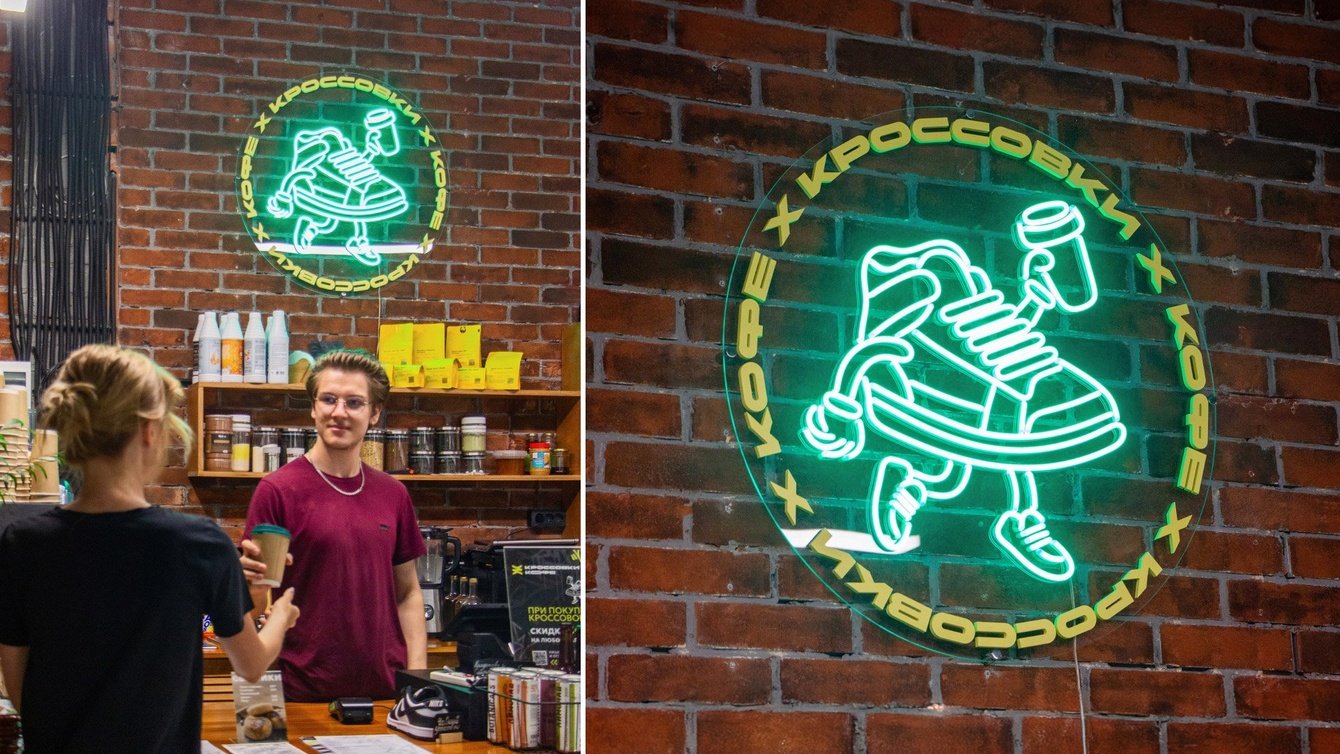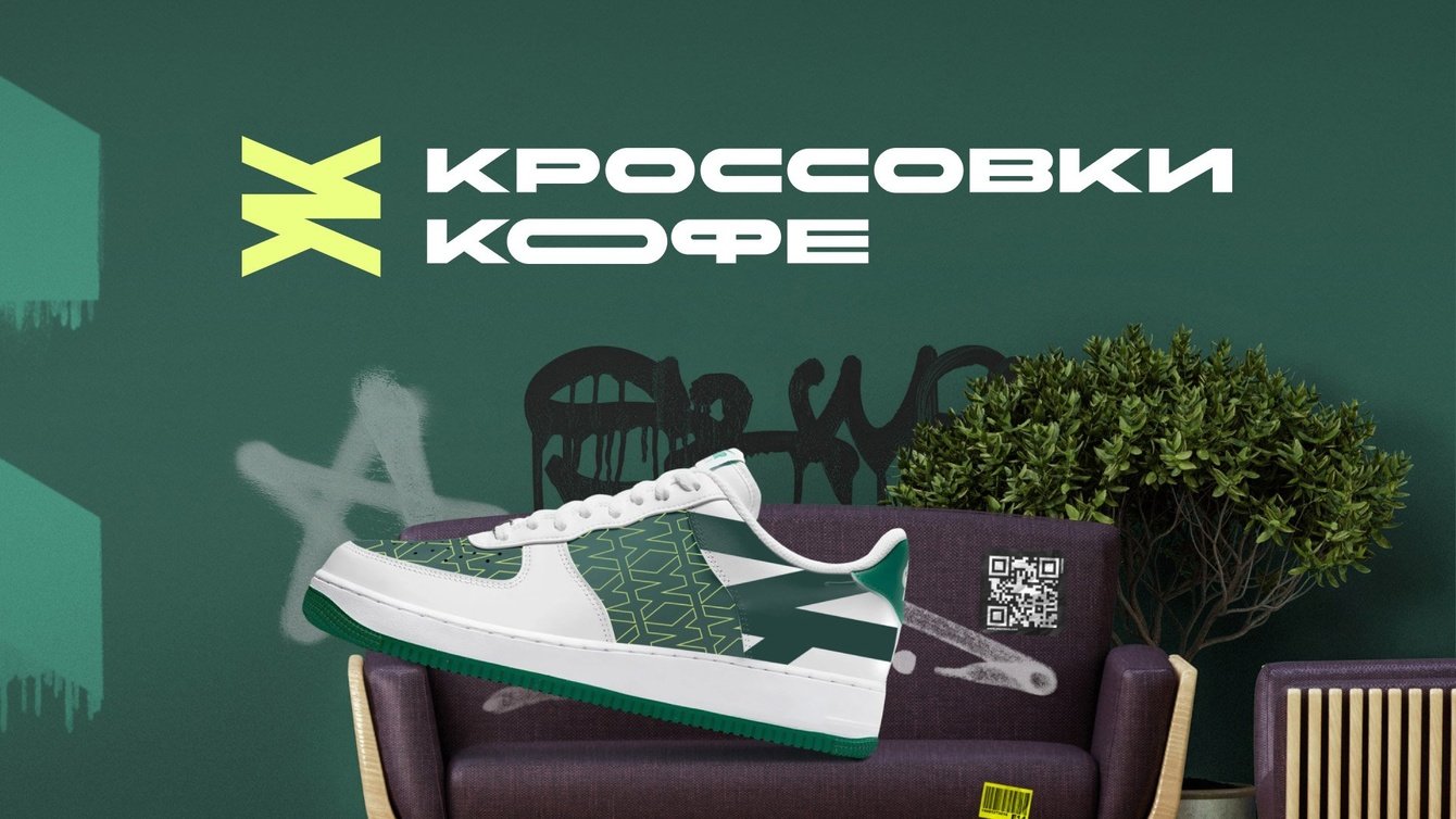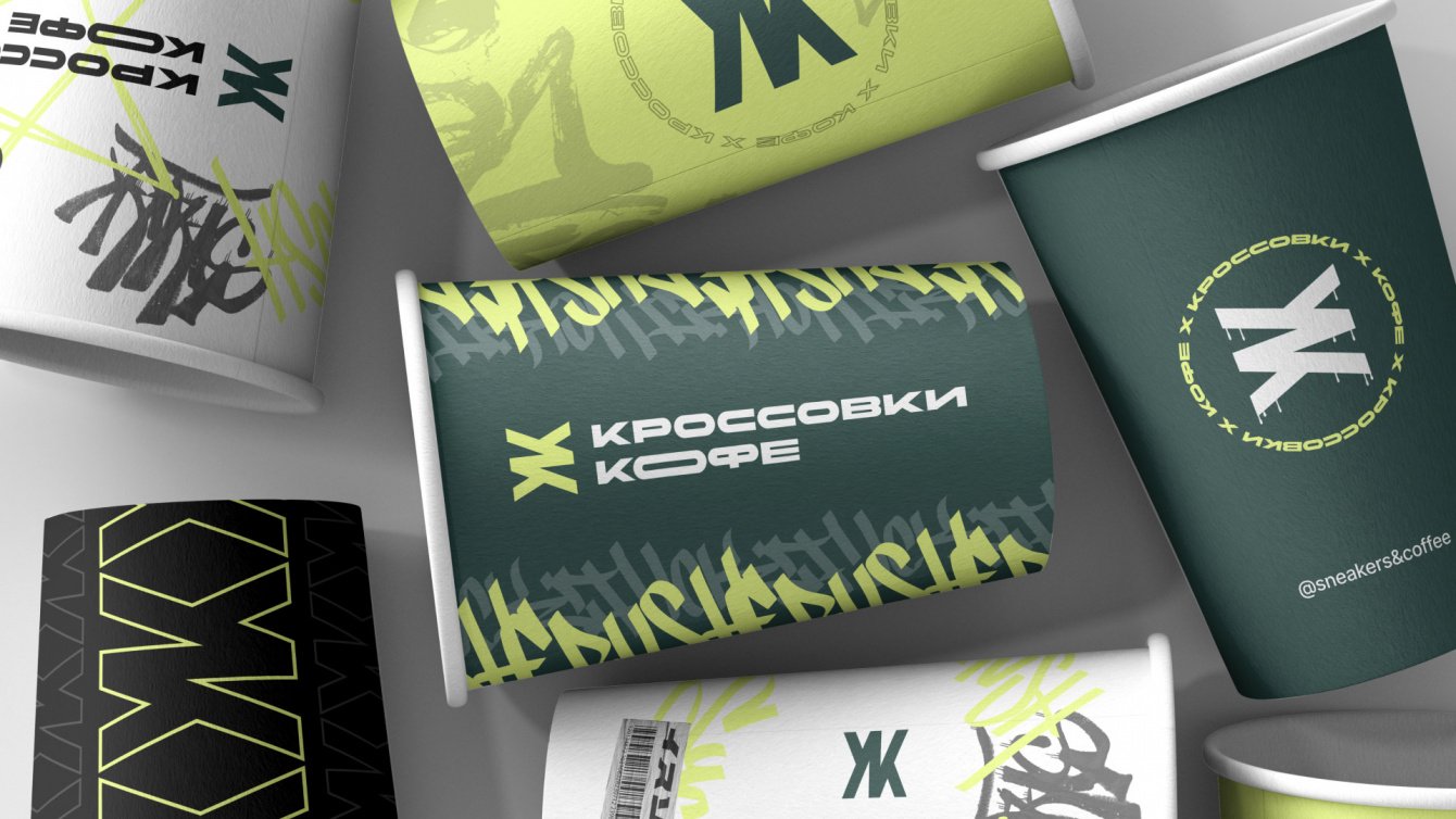 Брендинг магазина «Кроссовки и кофе», в котором в прямом смысле продаются качественные кроссовки и ароматный кофе. Клиент объединил свою торговую площадь с кофейней, и мы должны были обыграть это в цельной и необычной концепции.
