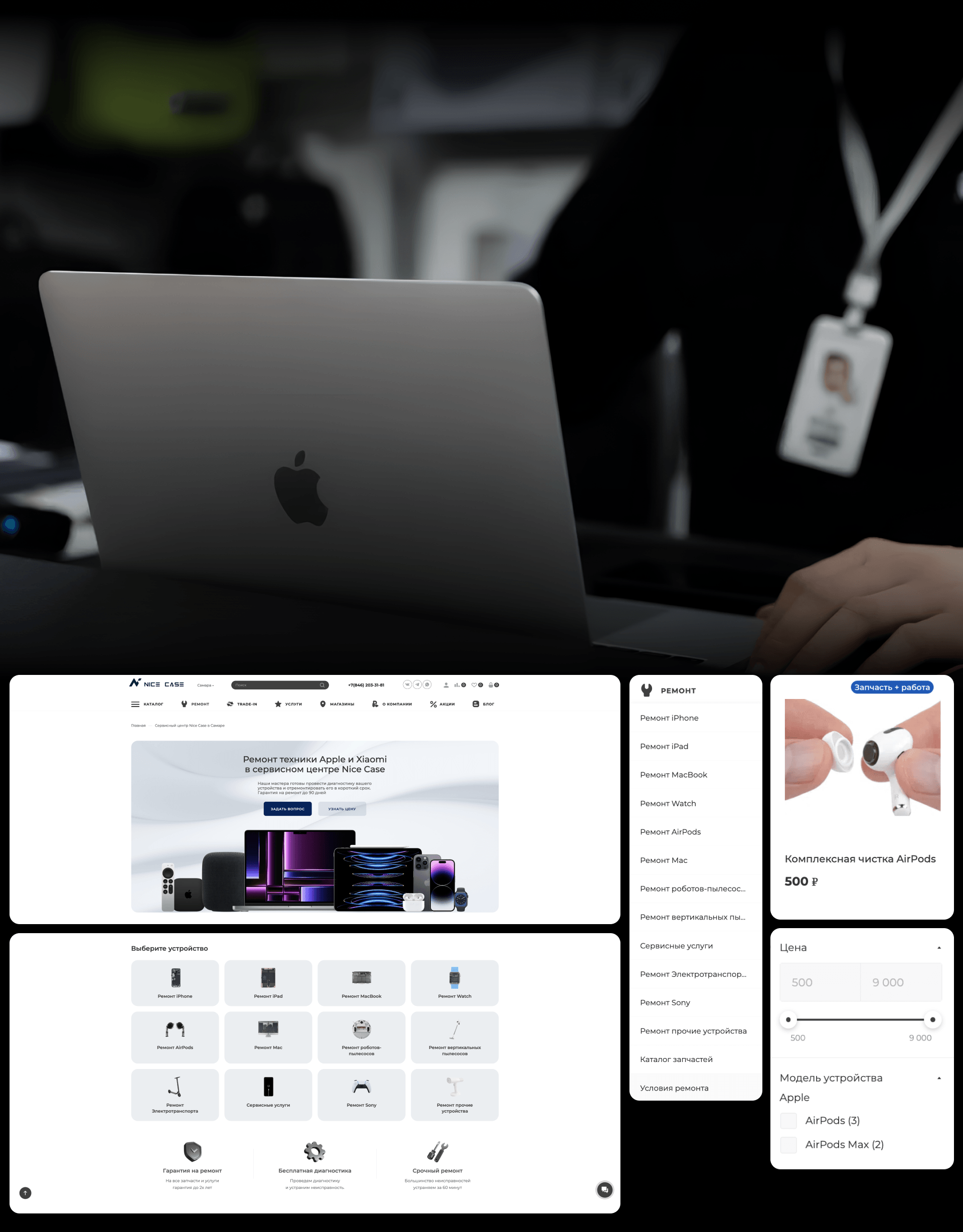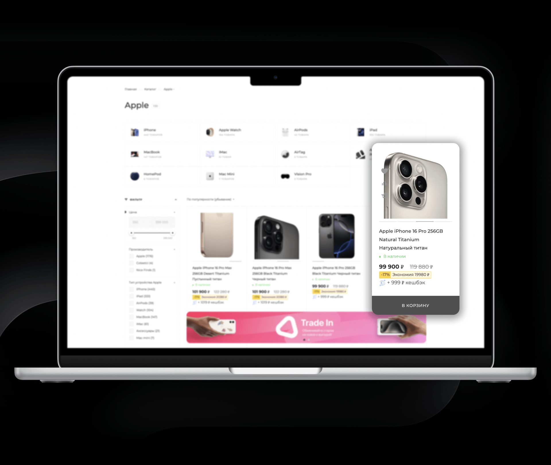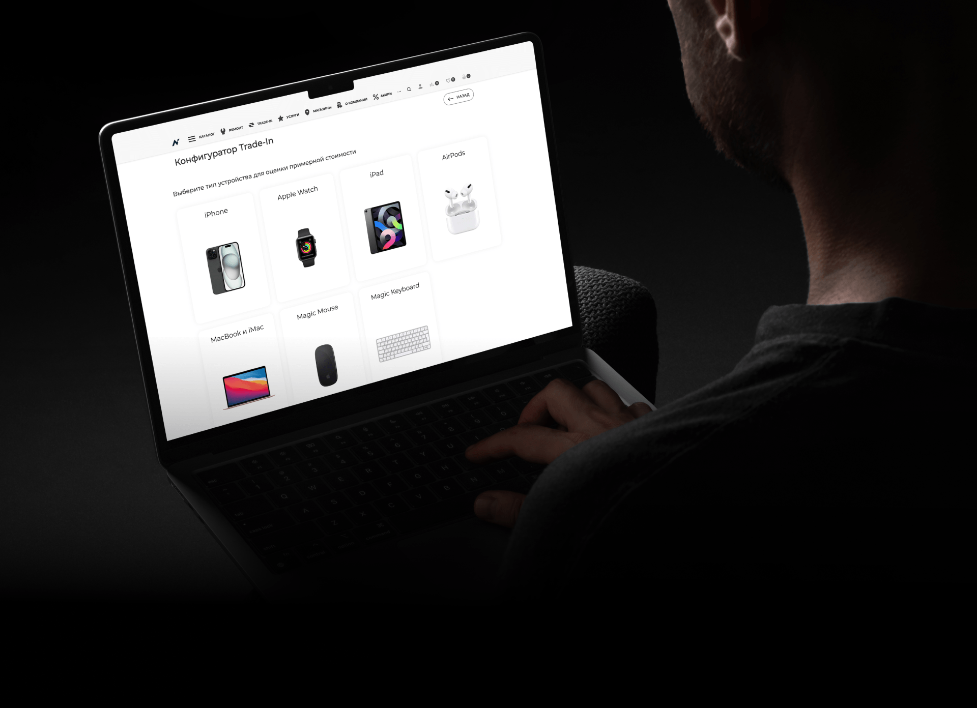 Представьте: клиент заходит узнать стоимость ремонта разбитого экрана iPhone, видит выгодное предложение по trade-in, и вместо ремонта обменивает старое устройство на новое с доплатой. Или наоборот — приходит за новыми AirPods, попутно записывается на замену батареи в MacBook и покупает умную колонку в подарок. Каждый сценарий продуман и реализован через интуитивные переходы между разделами.