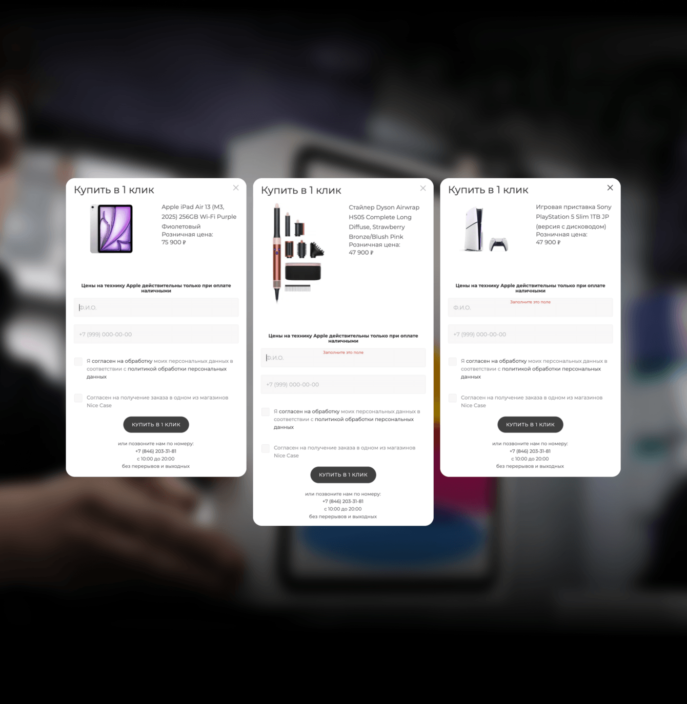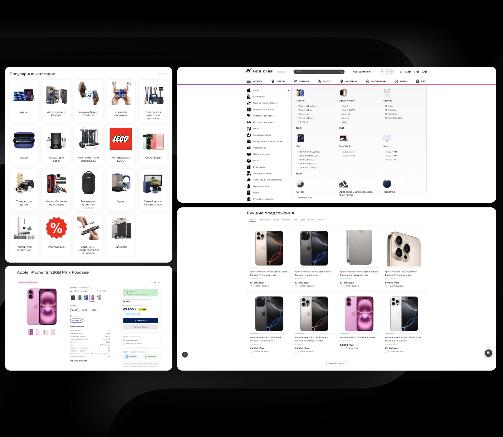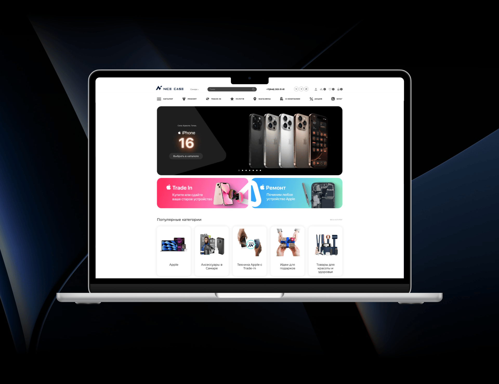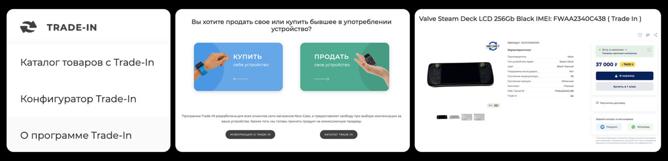 Представьте: клиент заходит узнать стоимость ремонта разбитого экрана iPhone, видит выгодное предложение по trade-in, и вместо ремонта обменивает старое устройство на новое с доплатой. Или наоборот — приходит за новыми AirPods, попутно записывается на замену батареи в MacBook и покупает умную колонку в подарок. Каждый сценарий продуман и реализован через интуитивные переходы между разделами.
