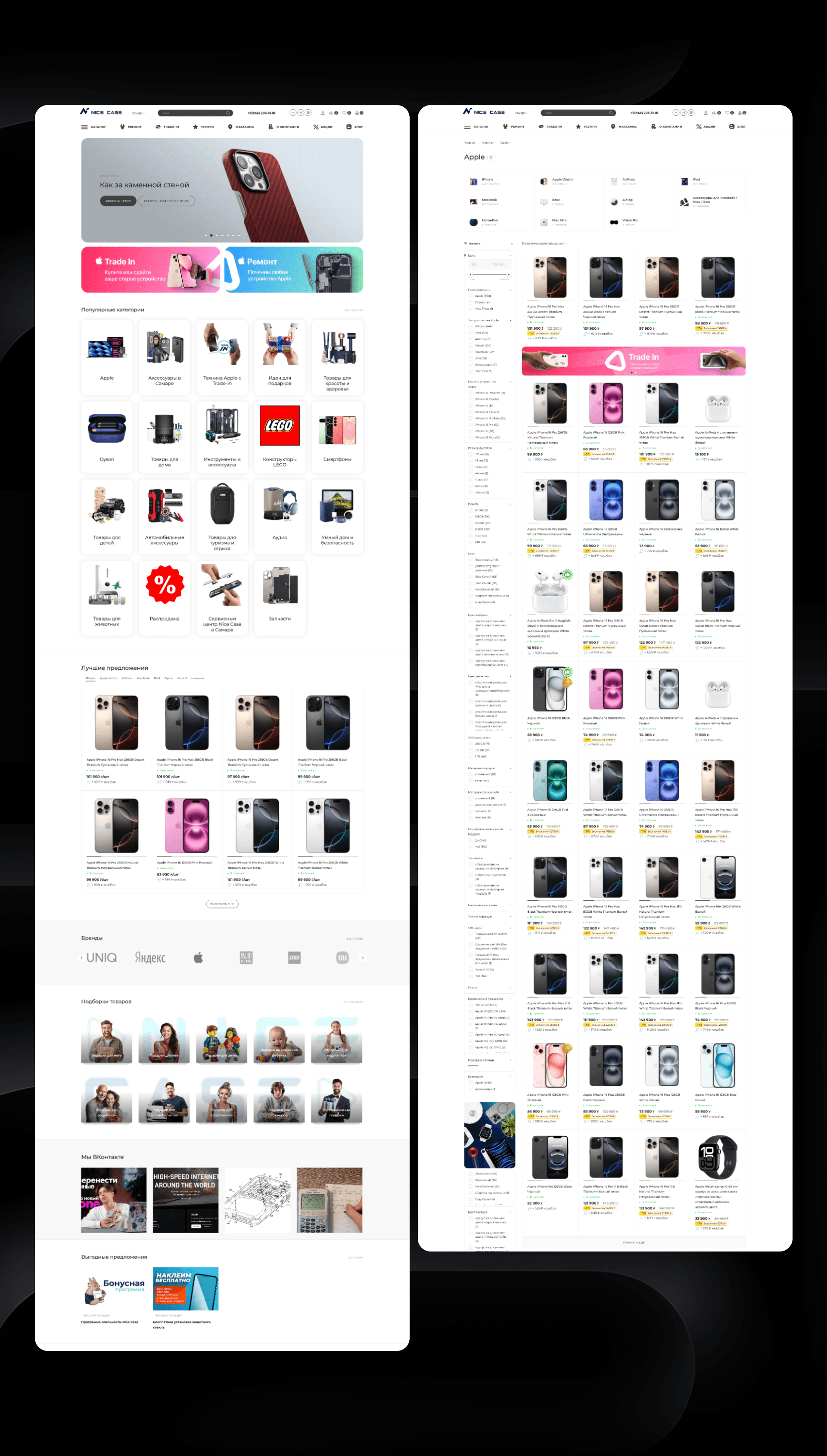 11 000 товаров и 1 300 услуг — такой объем контента требовал особого подхода к архитектуре информации. Мы создали двухуровневую систему навигации, где первый уровень — это привычные категории (iPhone, iPad, MacBook), а второй — умные фильтры, которые подстраиваются под контекст поиска.