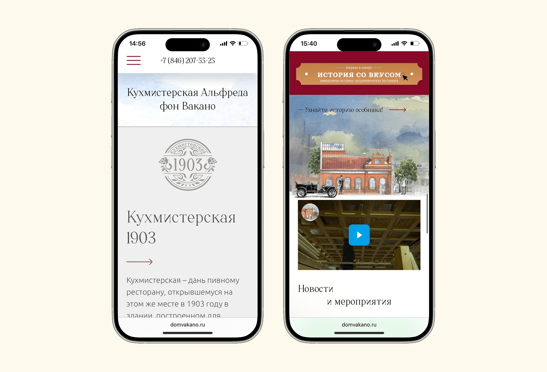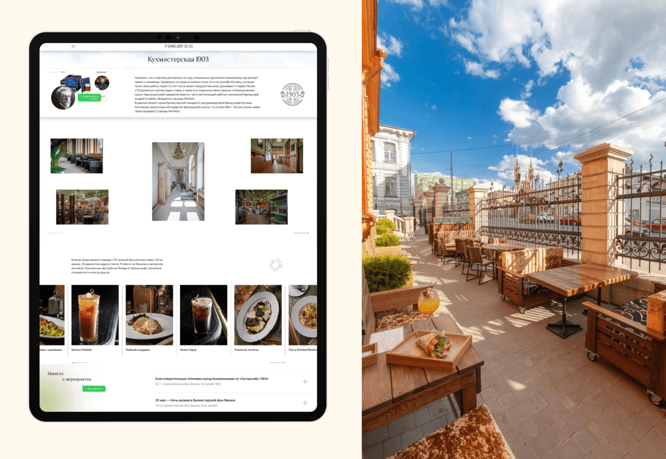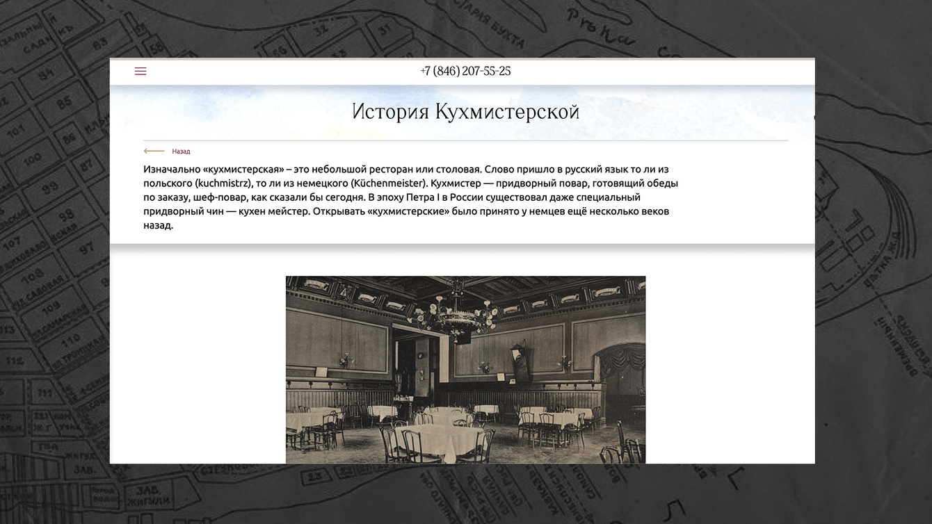 Сайт работает как приглашение — погрузиться в атмосферу особняка, почувствовать связь времен, забронировать свой опыт. Проект подтвердил: грамотная визуальная презентация исторического пространства создает добавленную ценность для гастрономического бизнеса. Когда место имеет историю, digital-платформа должна не просто информировать, а расска-зывать эту историю современным языком. Сайт Кухмистерской доступен по ссылке.