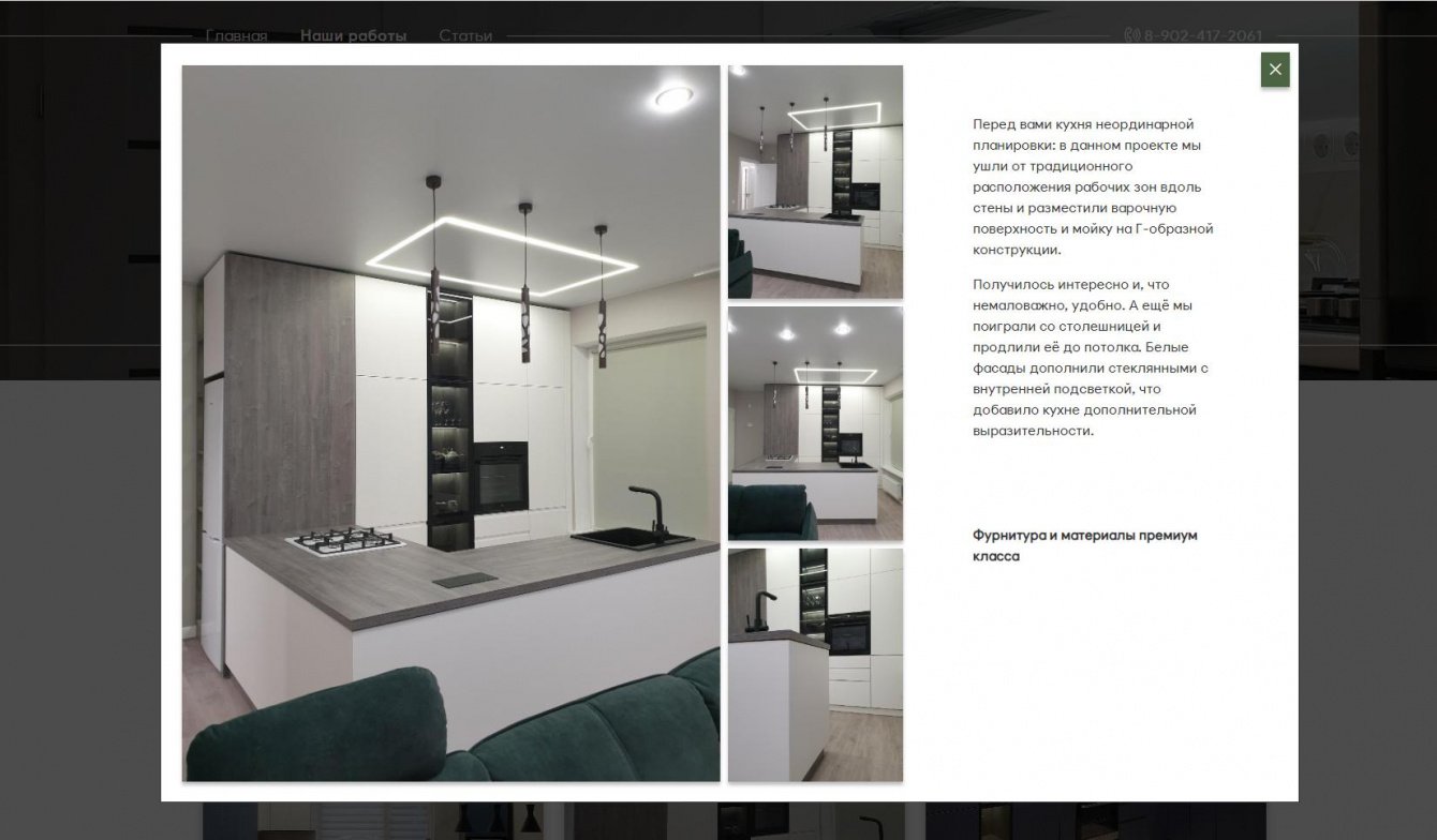 Объем фотографий работ по кухням огромный и для того чтоб не увеличивать время загрузки и не разбивать на пагинацию на страницах работ была использована технология ajax и все работы, кроме первого экрана подгружаются автоматически. Это позволяет держать в зеленой (ПК) и оранжевой (Мобильн.) зонах.