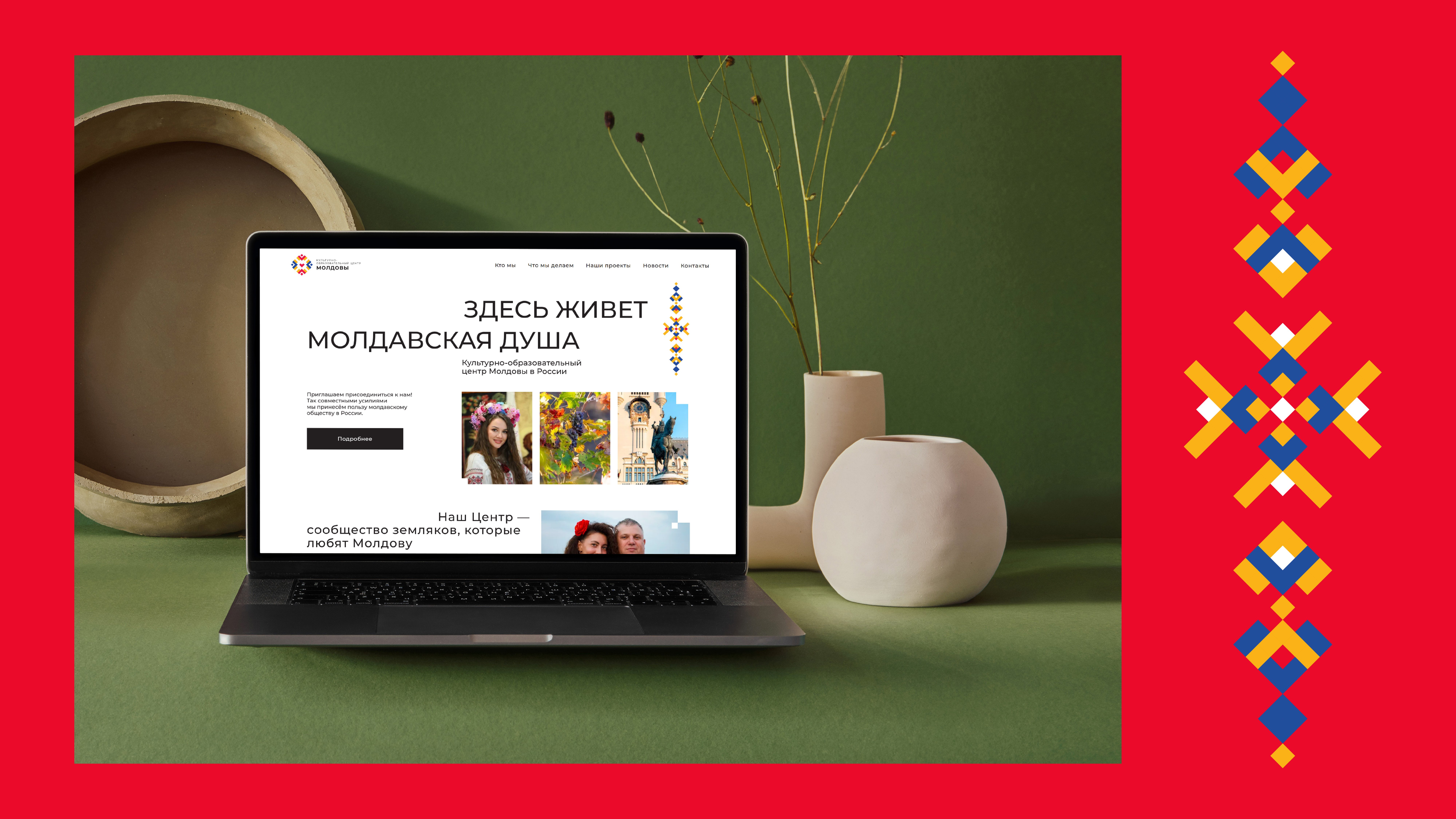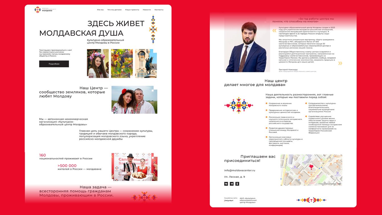 Выразительный логотип и яркий фирменный стиль послужили основой для разработки дизайна лендинг-страницы, которая стала доступным источником информации и эффективным инструментом продвижения деятельности Культурно-образовательного Центра Молдовы среди этнических молдован, проживающих в России.