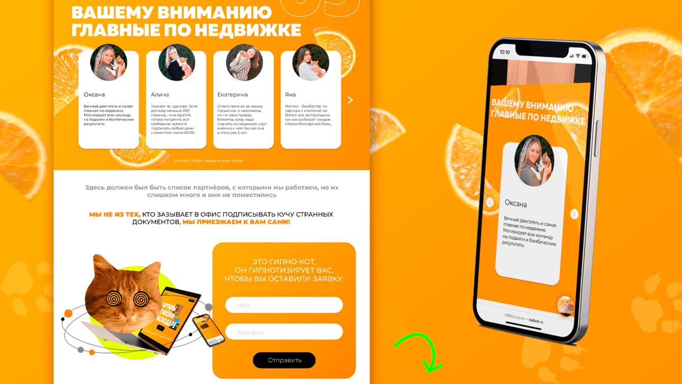 Кот не просто для красивой картинки – это талисман агентства. Сотрудники сделали фотосессию с котиками, а мы показали их в отдельном блоке на сайте: клиенты должны знать в лицо тех, кто поможет им выбрать жильё мечты.