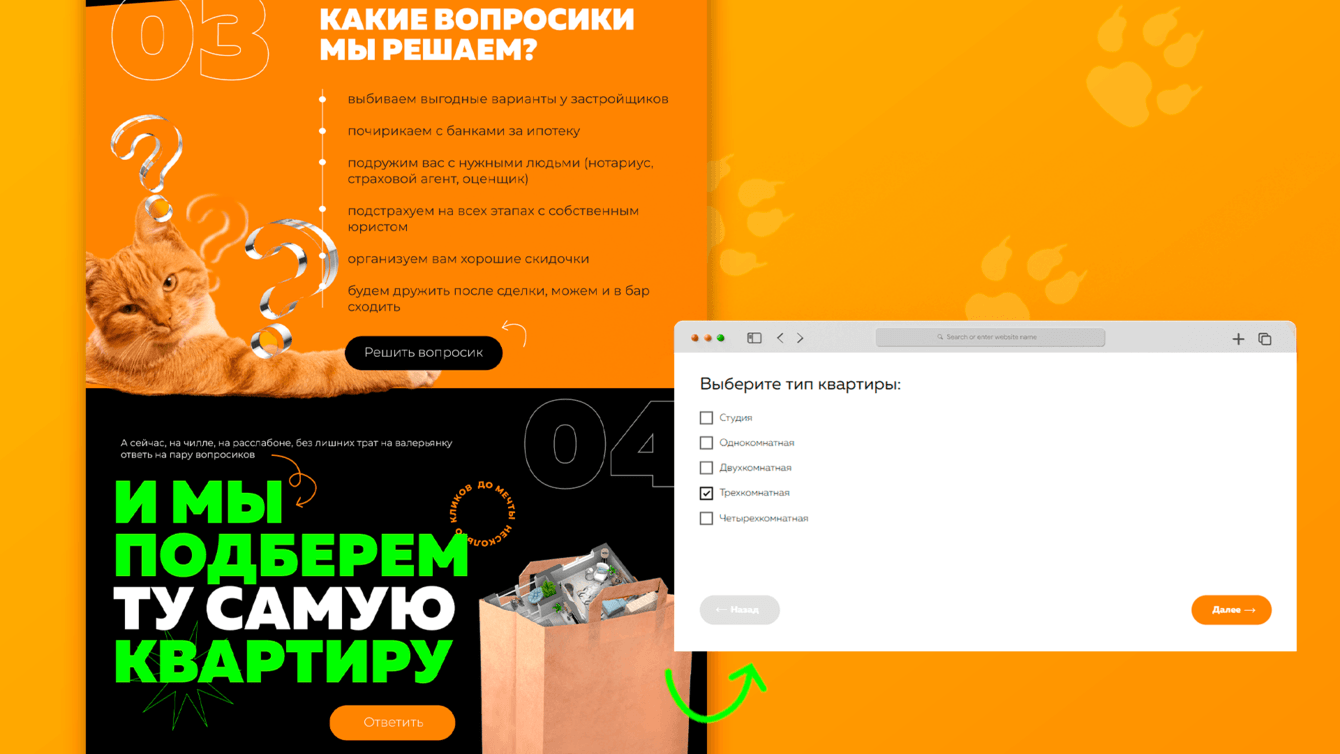 Прячем пасхалочки: например, визуалом планировки в крафтовом пакете проводим аналогию с тем, что купить квартиру также легко, как сходить за продуктами в супермаркет. Здесь же в блоке добавляем квиз по подбору квартиры. Да, это как у всех, но чего не сделаешь ради удобства потенциального клиента?