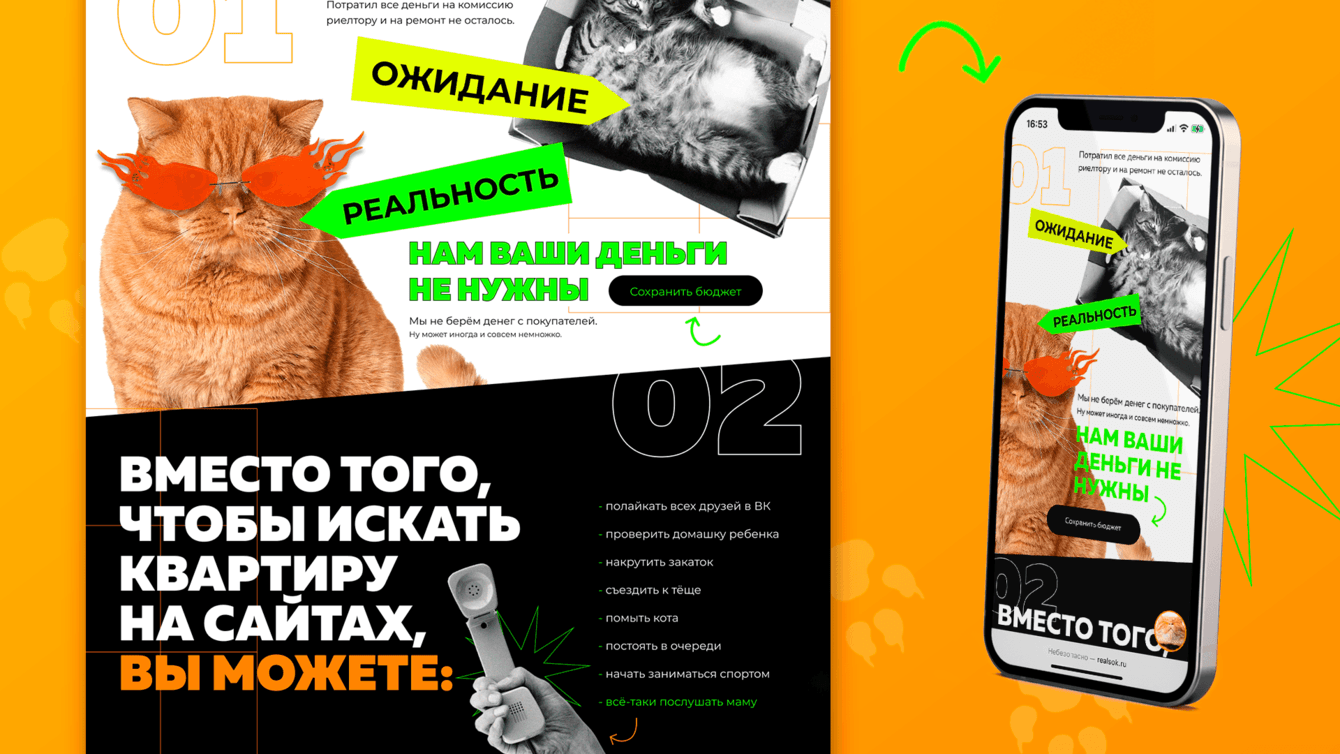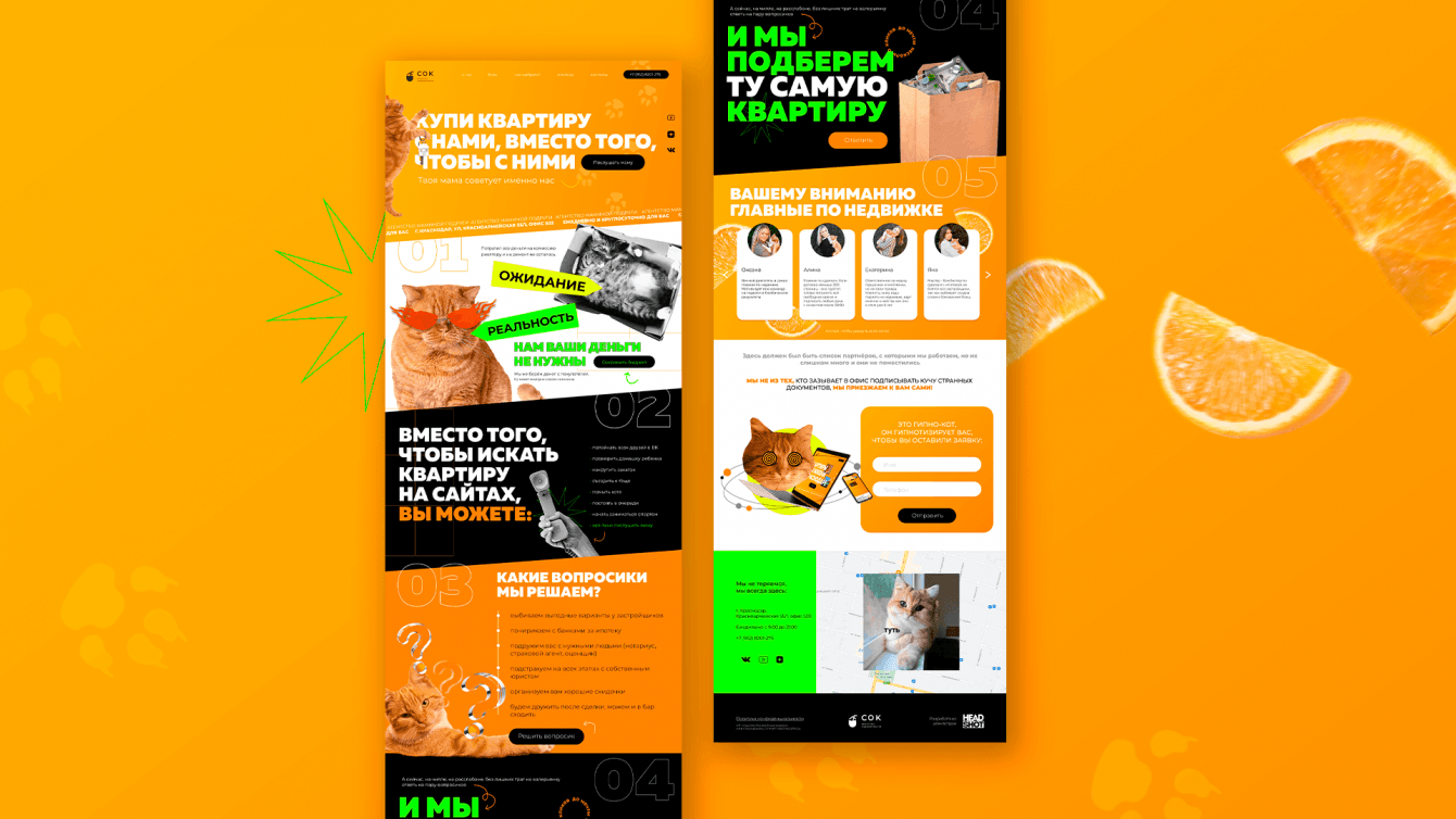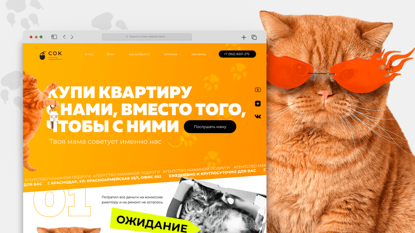 "Ничего стандартного!" – сказал клиент. Почесали репу, сели и совместно расписали тексты для сайта так, чтобы сразу стало ясно – здесь работают креативные, весёлые и открытые специалисты. Никаких скучных заголовков, типа "Квартиры от застройщиков в Краснодаре". Только юмор, только хардкор. И котики, конечно, котиков любят все.