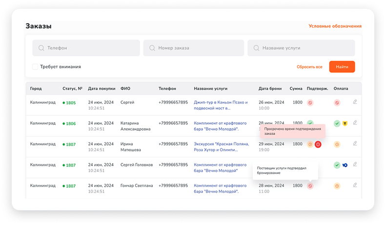 Для дополнительного контроля каждый вечер партнер получает список броней на услуги, забронированные на следующий день, а в конце каждого месяца финансовый отчет.