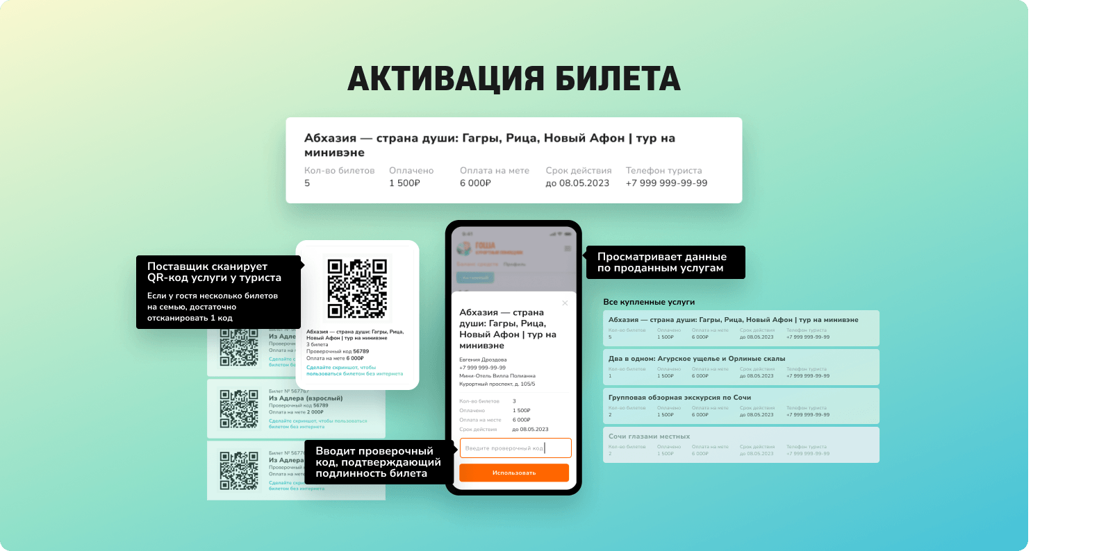 При заселении в отеле или гостевом доме турист получает QR-код со ссылкой на регистрацию в сервисе. На одной площадке он выбирает и приобретает различные услуги – экскурсии, билеты в музеи, сертификат в СПА и др. В результате турист получает необходимую услугу со скидкой, поставщик клиента, а сервис и гостевой дом комиссию.