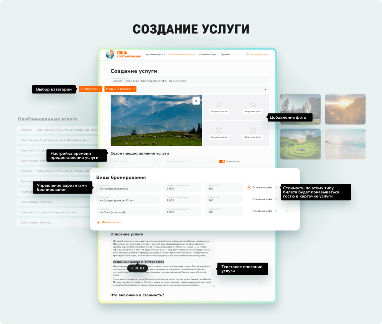 Поставщики услуг регистрируются в сервисе как партнеры и добавляют свои услуги с подробным описанием, фото и ценой. Можно задать различные характеристики – сезонность, разная цена для взрослых и детей и т. д.