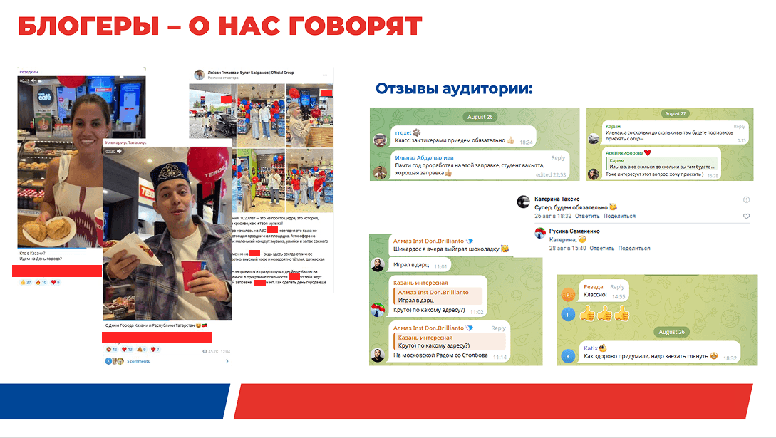 Так, бренд пригласил своих текущих и потенциальных клиентов в гости на праздник. В Казани, например, АЗС бренда стали частью масштабных гуляний, приуроченных к 1020-летию города. В Перми отметили первый год работы АЗС, а в Саратове отпраздновали вместе приход бренда в регион. В Нижнем Новгороде и Москве провели для клиентов «День открытых дверей».
