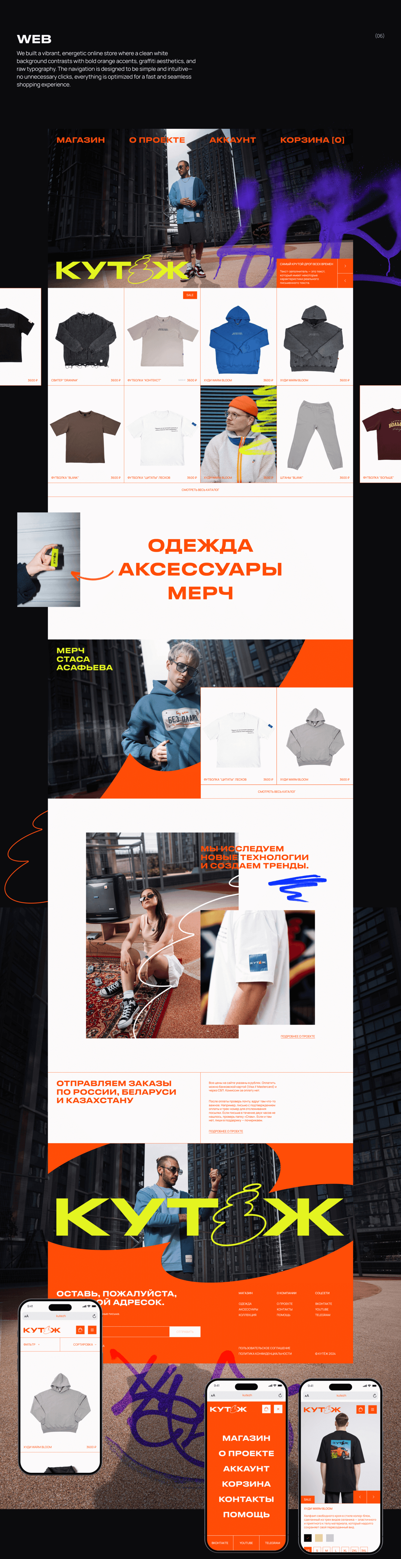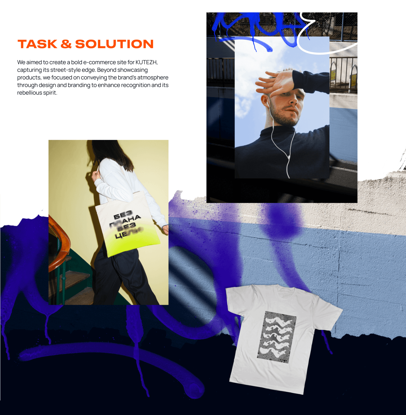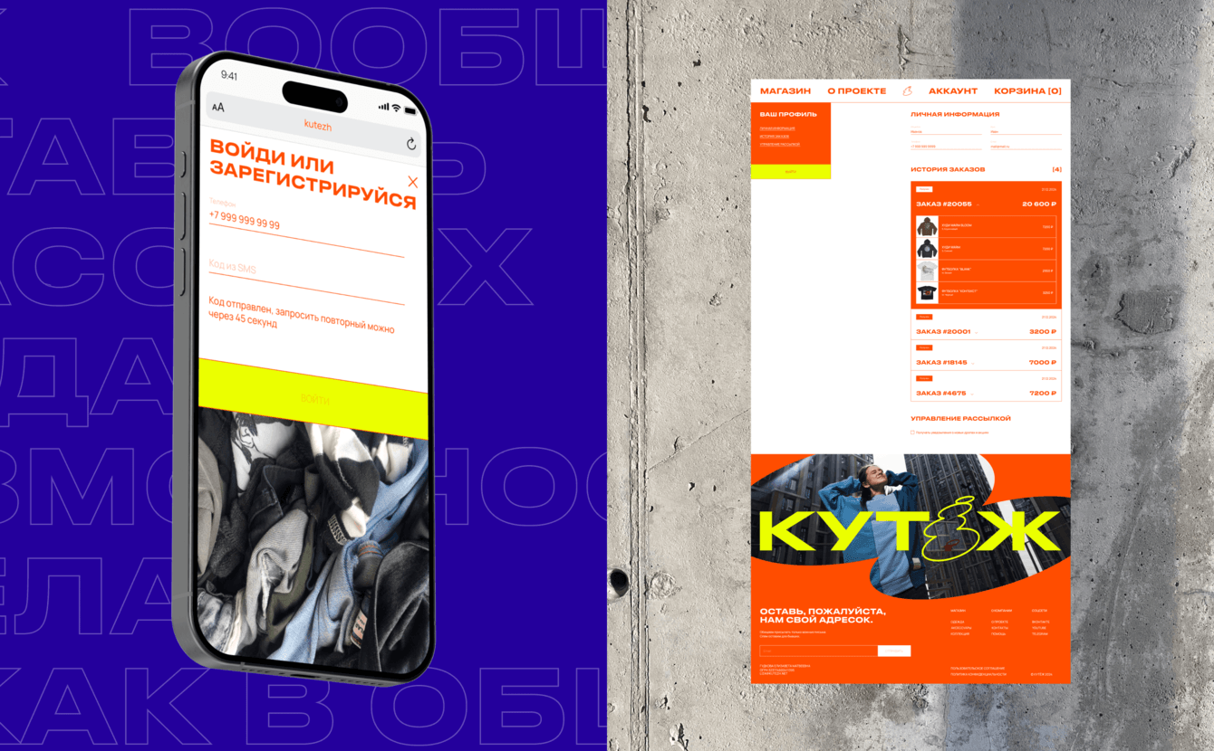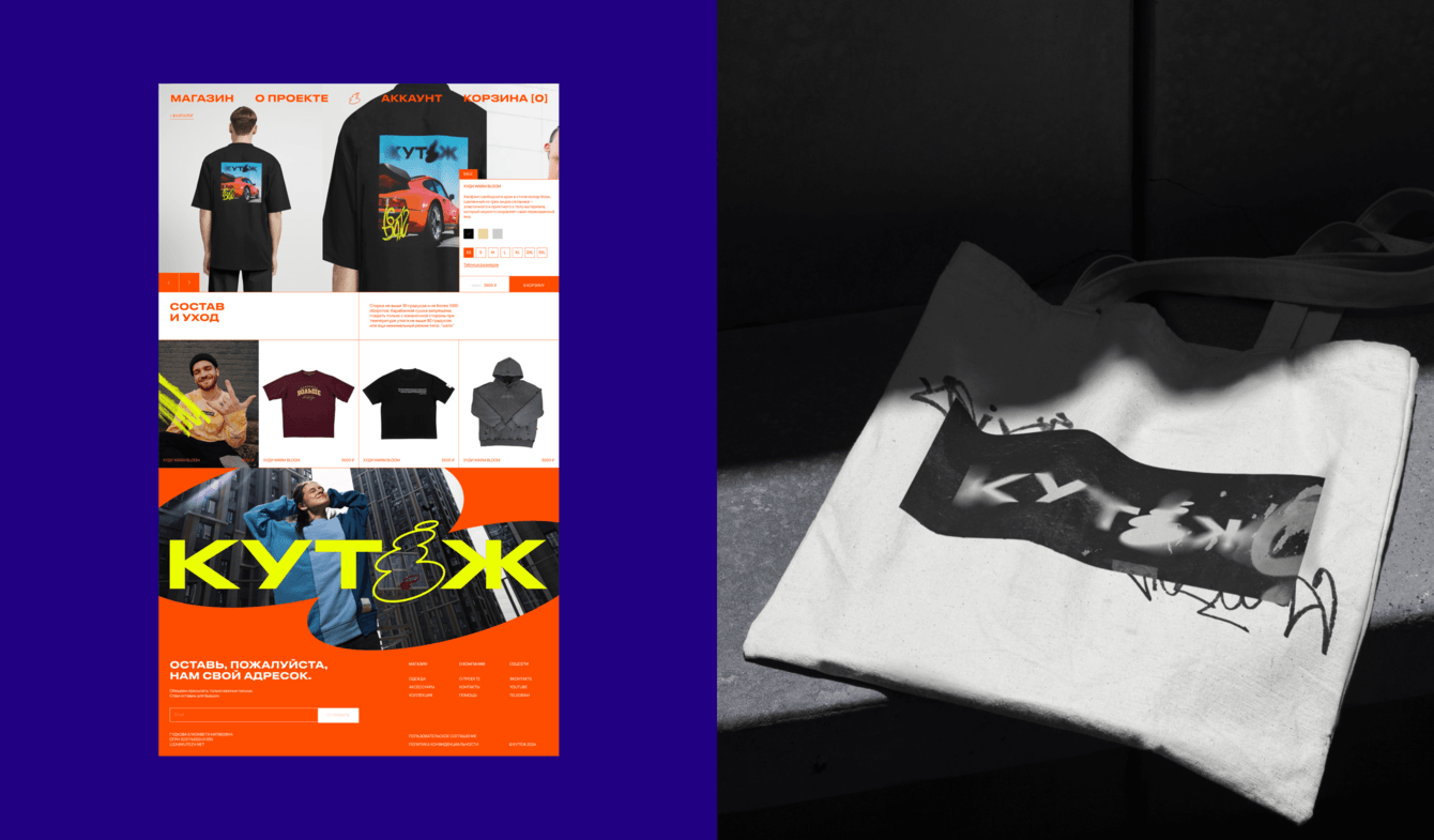 Задача состояла в создании айдентики и интернет-магазина для бренда стильной повседневной одежды «Кутёж». Нужно было разработать яркий и дерзкий визуал, вдохновлённый граффити-культурой и DIY-эстетикой, подчеркнув уличный характер бренда. Особое внимание уделялось функциональности сайта, поскольку активность аудитории во время дропов коллекций способна создавать высокие нагрузки, с которыми справлялись далеко не все площадки.