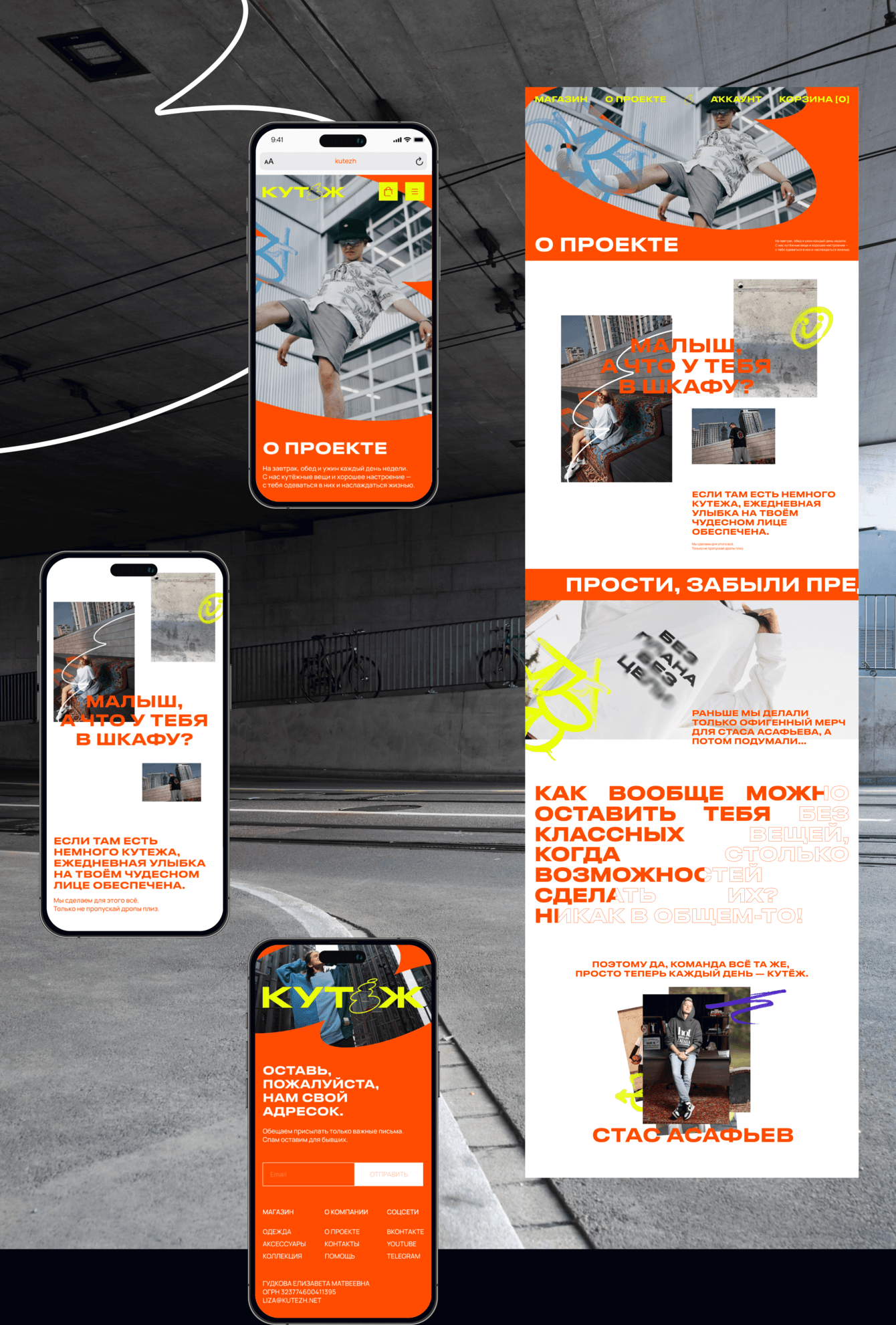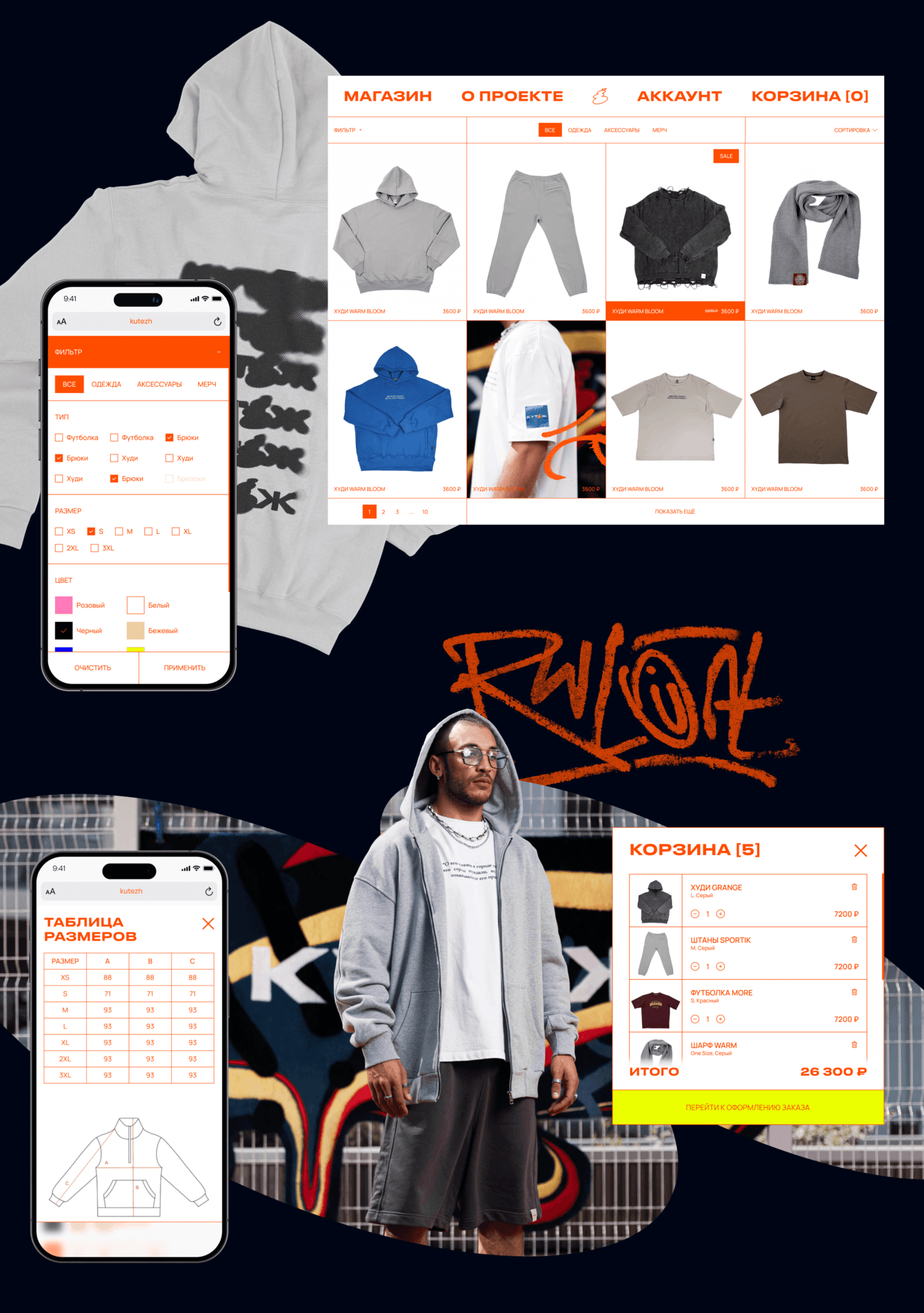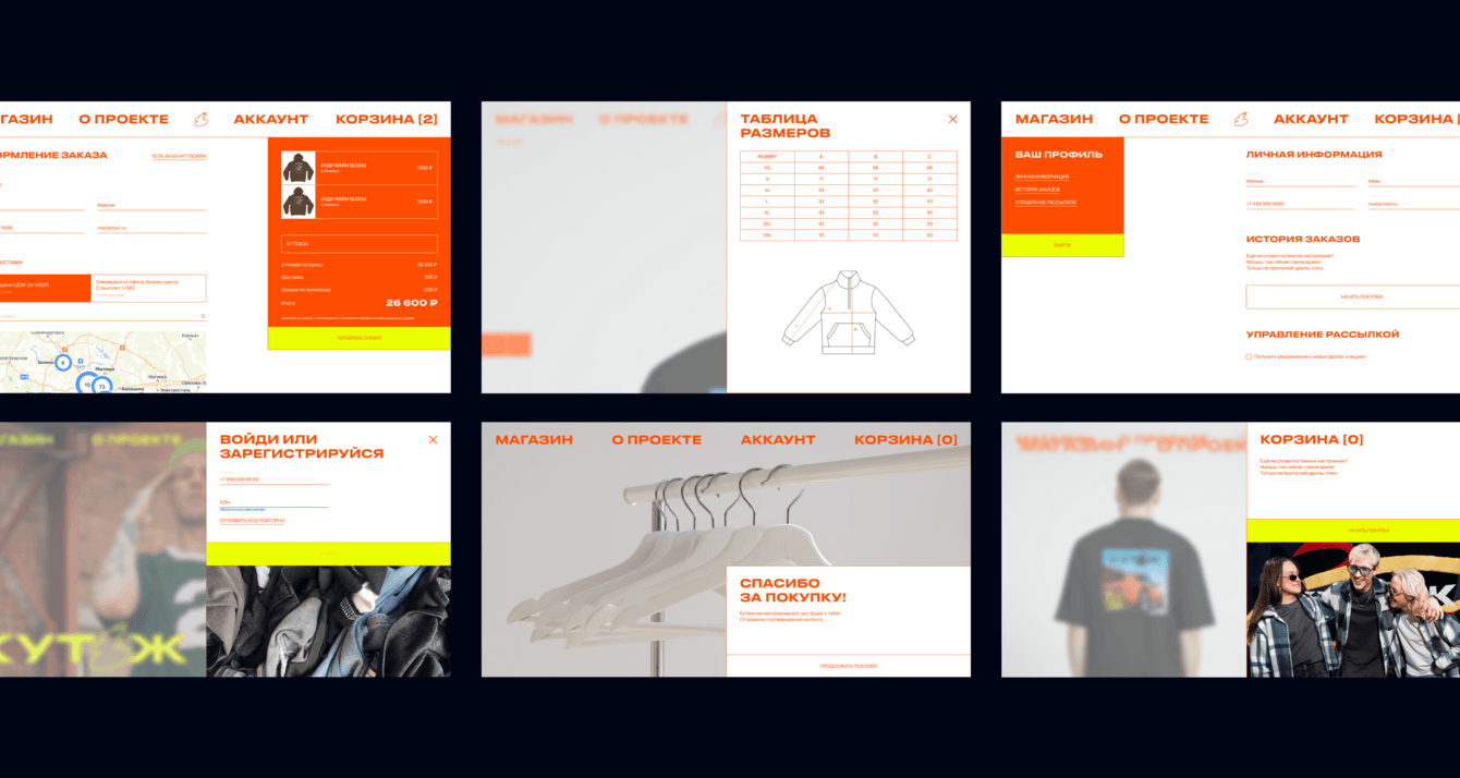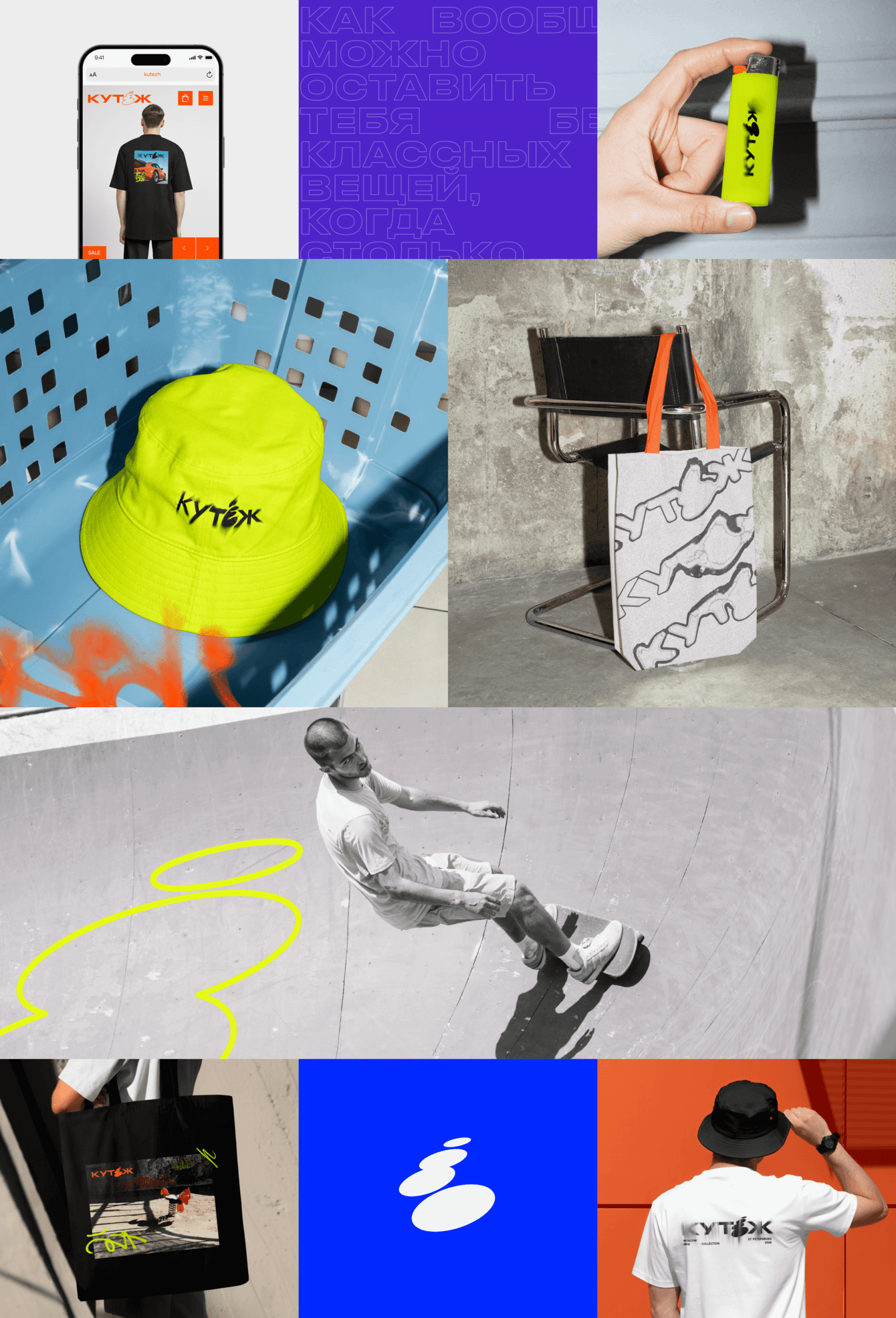 Задача состояла в создании айдентики и интернет-магазина для бренда стильной повседневной одежды «Кутёж». Нужно было разработать яркий и дерзкий визуал, вдохновлённый граффити-культурой и DIY-эстетикой, подчеркнув уличный характер бренда. Особое внимание уделялось функциональности сайта, поскольку активность аудитории во время дропов коллекций способна создавать высокие нагрузки, с которыми справлялись далеко не все площадки.