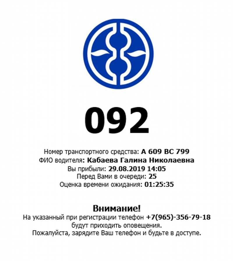 Оповещение о необходимости заезда и номере ворот на весовом терминале приходит в виде текстового уведомления на мобильный телефон водителя, указанный при получении талона.