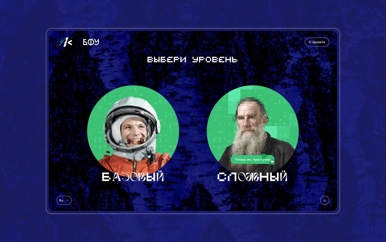 Квиз представляет собой игру на проверку знаний, которая состоит из двух уровней — базового и сложного. Их олицетворяют Юрий Гагарин и Лев Толстой, по ховеру также появляются фразы, которые могли бы сказать эти известные деятели. Базовый уровень ориентирован иностранцев, изучающих русский язык и культуру, а сложный предназначен для русскоговорящих пользователей.
