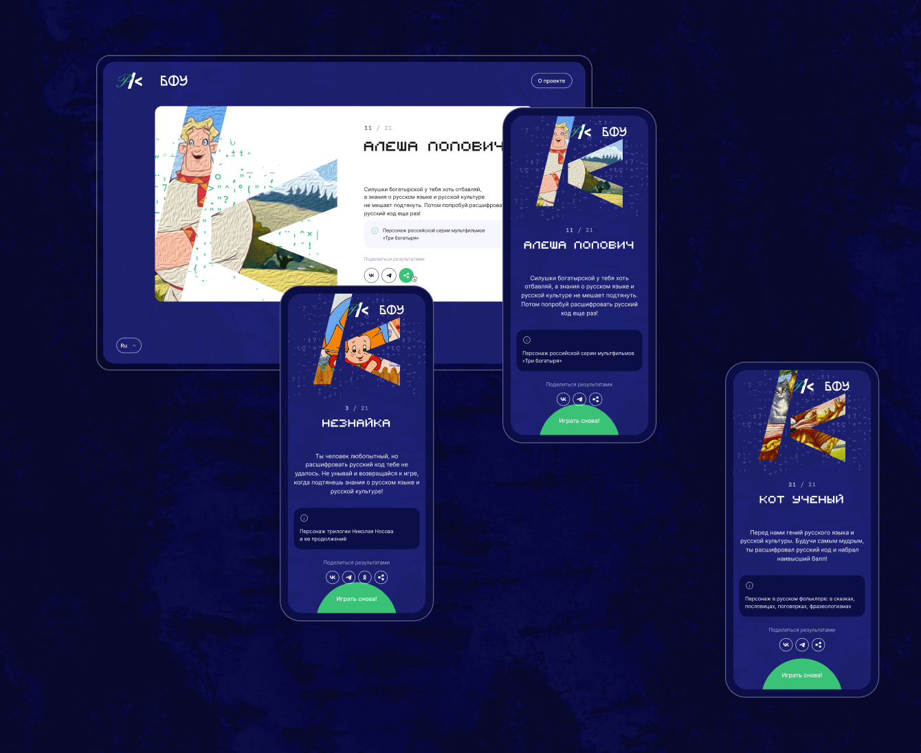 Разработка фронтенда этого проекта была для нас настоящим вызовом, но результат превзошел ожидания заказчика. Викторина не только максимально интерактивна, но и технически безупречна.