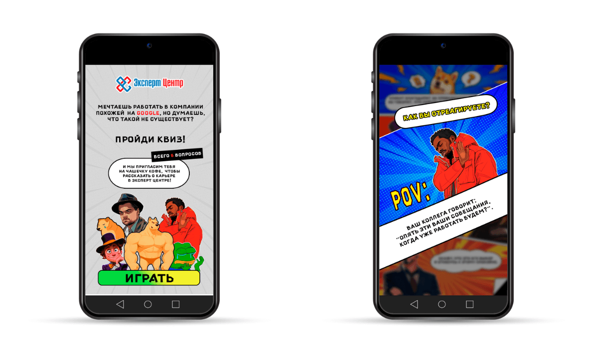 Первый квиз для привлечения менеджеров по продажам иллюстрирован мемами для повышения уровня вовлечения с учетом интересов ЦА. Также это визуальное решение дополнительно выделило предложение клиента среди вакансий остальных компаний. Вопросы квиза помогали в оценке эмоционального интеллекта соискателей. Правильный ответ не показывался, применялась сегментация по количеству верных ответов.