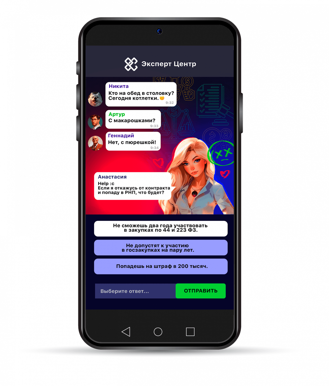 Второй квиз для привлечения соискателей на должность специалиста по закупкам реализован в виде чата в социальной сети, в котором участники задают вопросы по теме государственных и коммерческих закупок. Соискатель выступает в роли одного из экспертов, которому нужно ответить на вопросы, выбрав правильный ответ из трех вариантов. Вопросы по теме тендеров в игровой форме выявляют уровень соискателя, предоставляя HR не только контактные данные из лидоформы, но и информацию о профессиональных навыках.