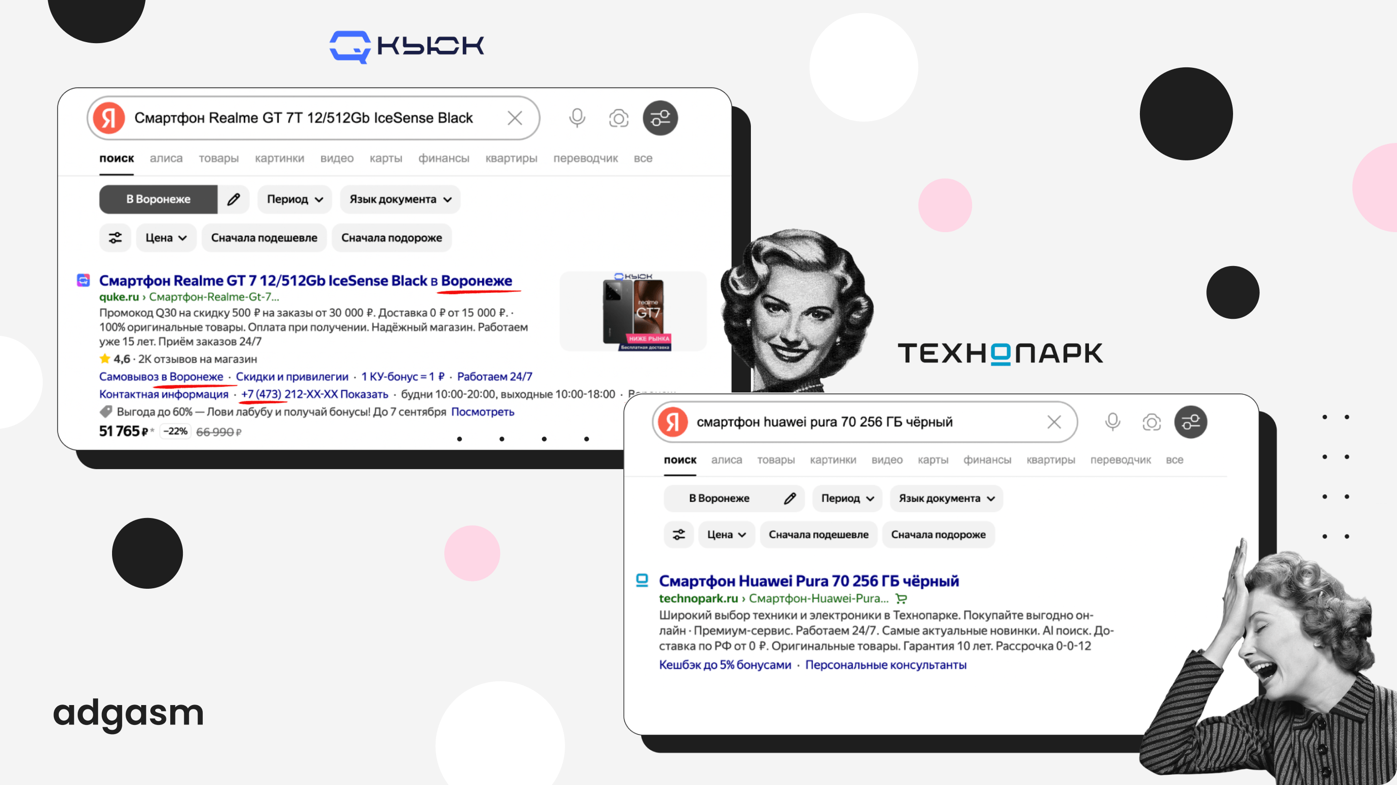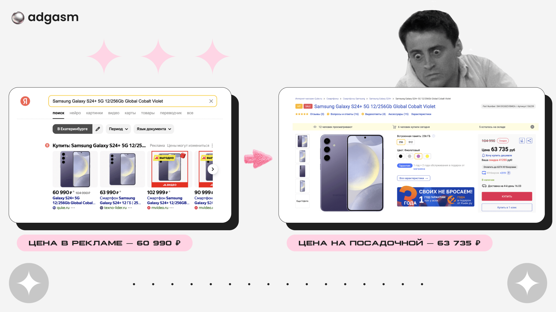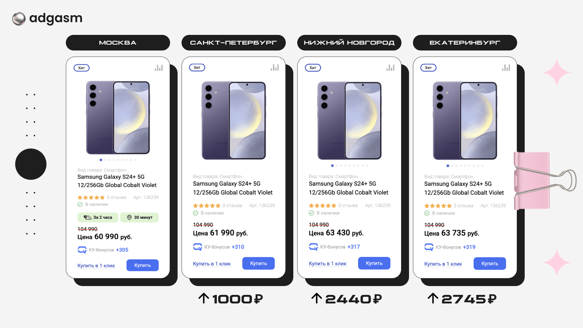 Представьте — клиент из Екатеринбурга кликает по объявлению с телефоном за 60 990 ₽, переходит на сайт, автоматически определяется геопозиция, и стоимость меняется на 63 735 ₽ (или может измениться наличие).