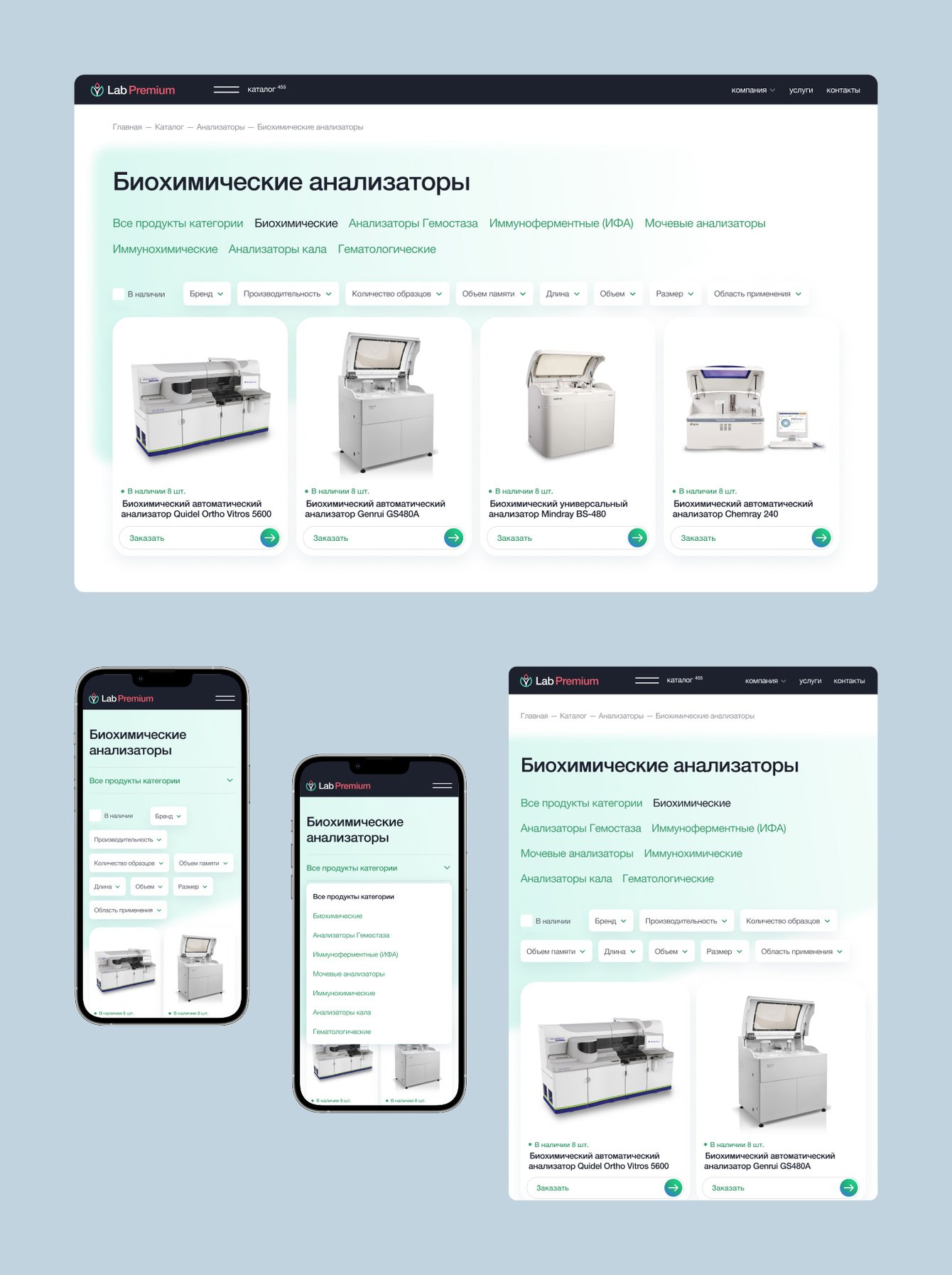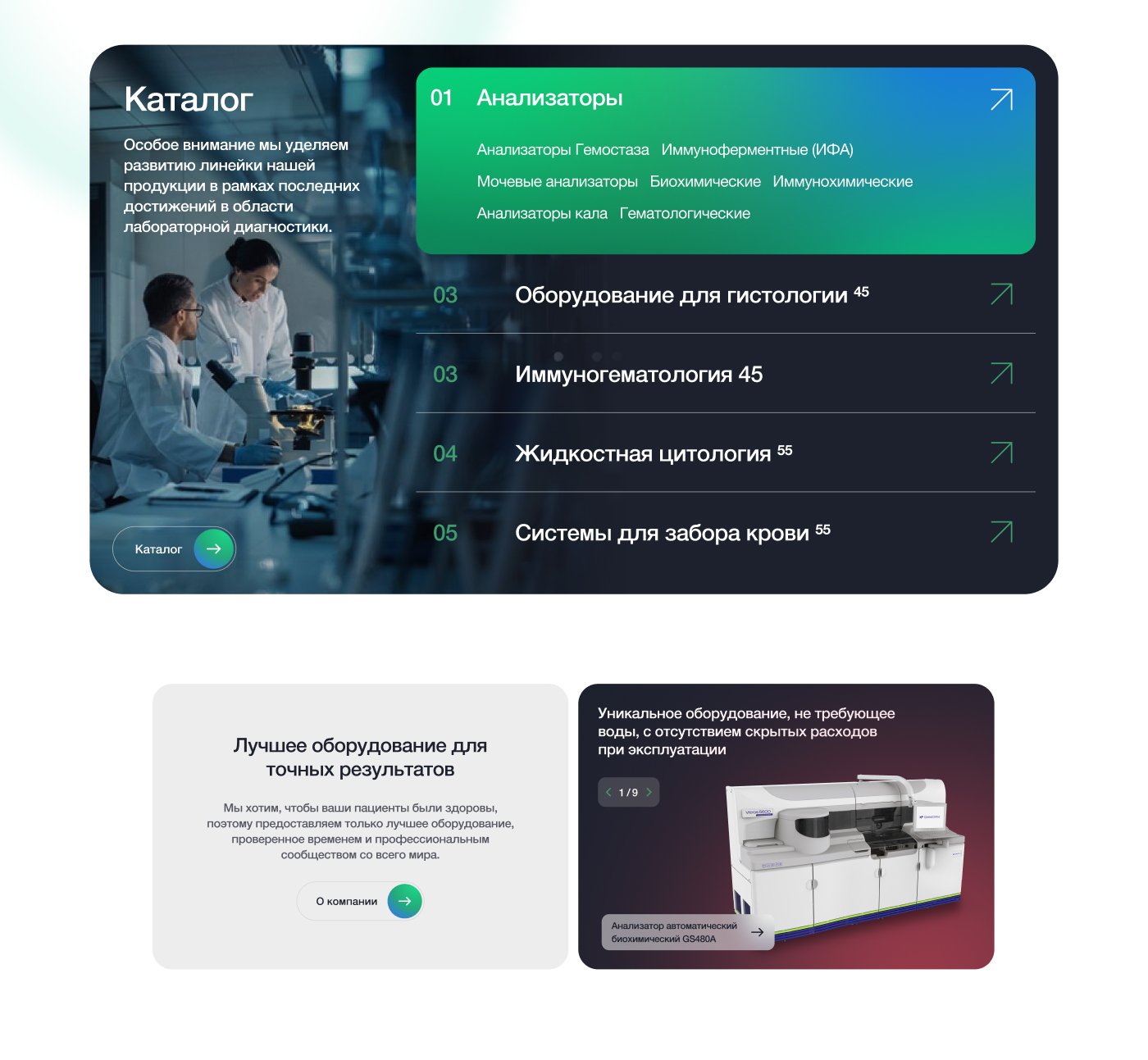 Обновить айдентику, стилеобразующие элементы, создать концепцт-дизайн имиджевого корпоративного сайта с каталогом медицинских анализаторов, комплектующих и сопутствующих товаров.