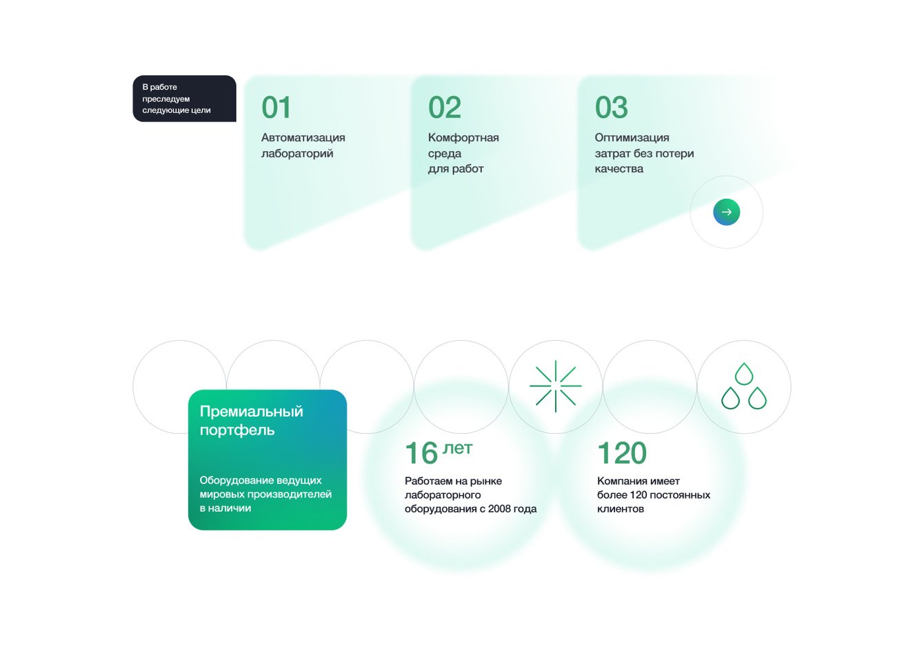 На сайте через дизайн мы отразили и лабораторные процессы. Например, анимация наведения мыши имитирует падение капли на лабораторное стекло или его «перекрытие» другим сверху. Мы применяем этот эффект на страницах интерфейса, наравне с имитацией самих лабораторных стекол в качестве составляющей композиции блока с основными принципами.