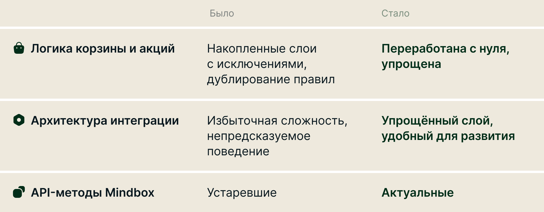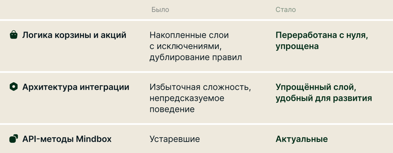 Это привело к накоплению избыточной сложности: дублированию правил, труднопредсказуемому поведению системы и сложности доработок. Параллельно Mindbox обновил API-методы — но переходить на них в работающей системе без веской причины не имело смысла. Такой причиной стала миграция. Интеграционный слой был переосмыслен и реализован заново.