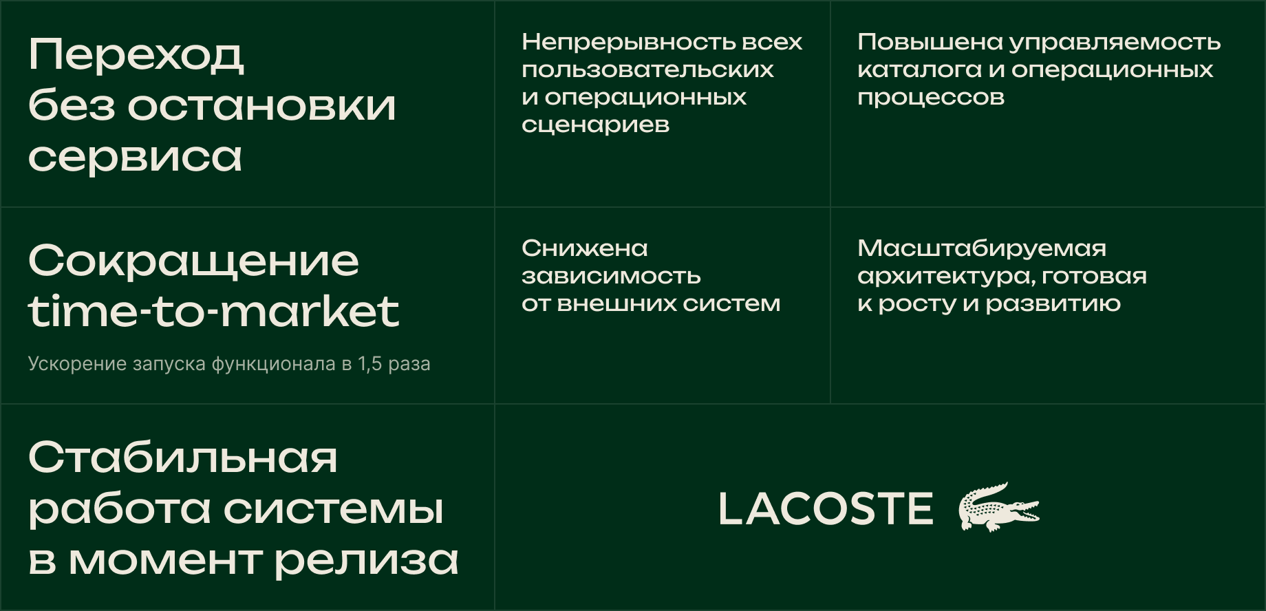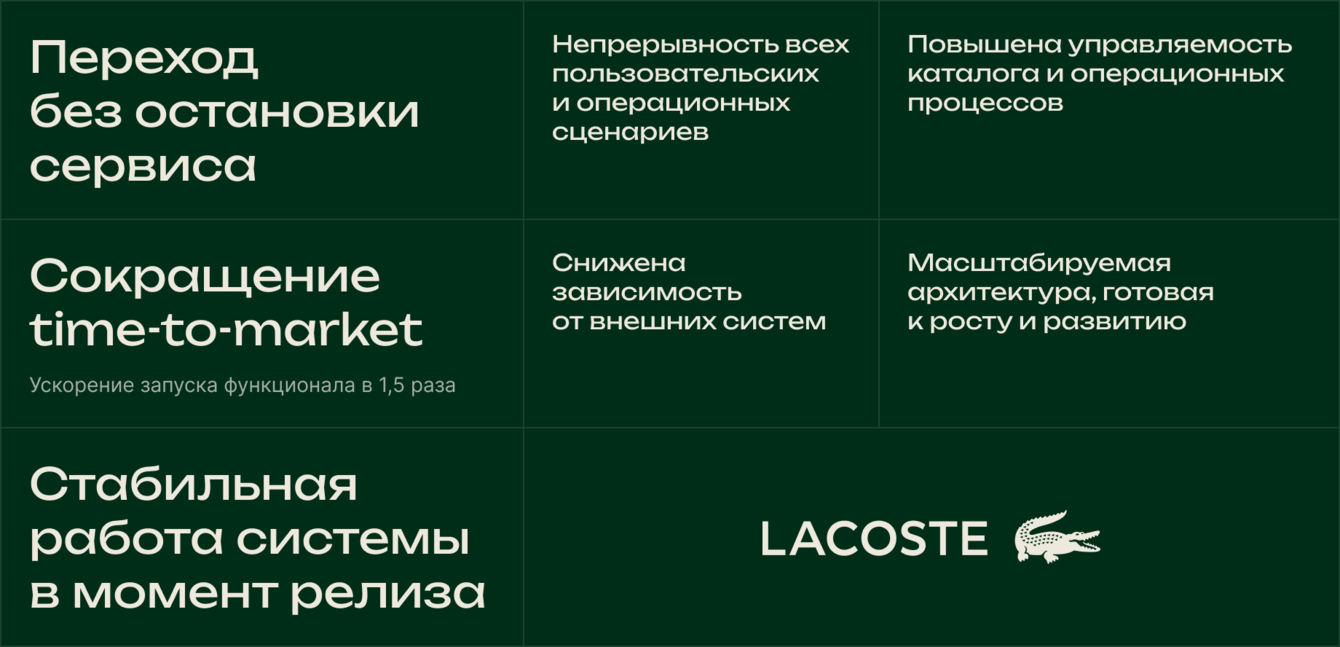 Для премиального бренда с непрерывным потоком заказов любой сбой в процессе перехода имеет прямые операционные и репутационные последствия. Для аудитории Lacoste качество критично на каждом уровне — от продукта до цифрового опыта.