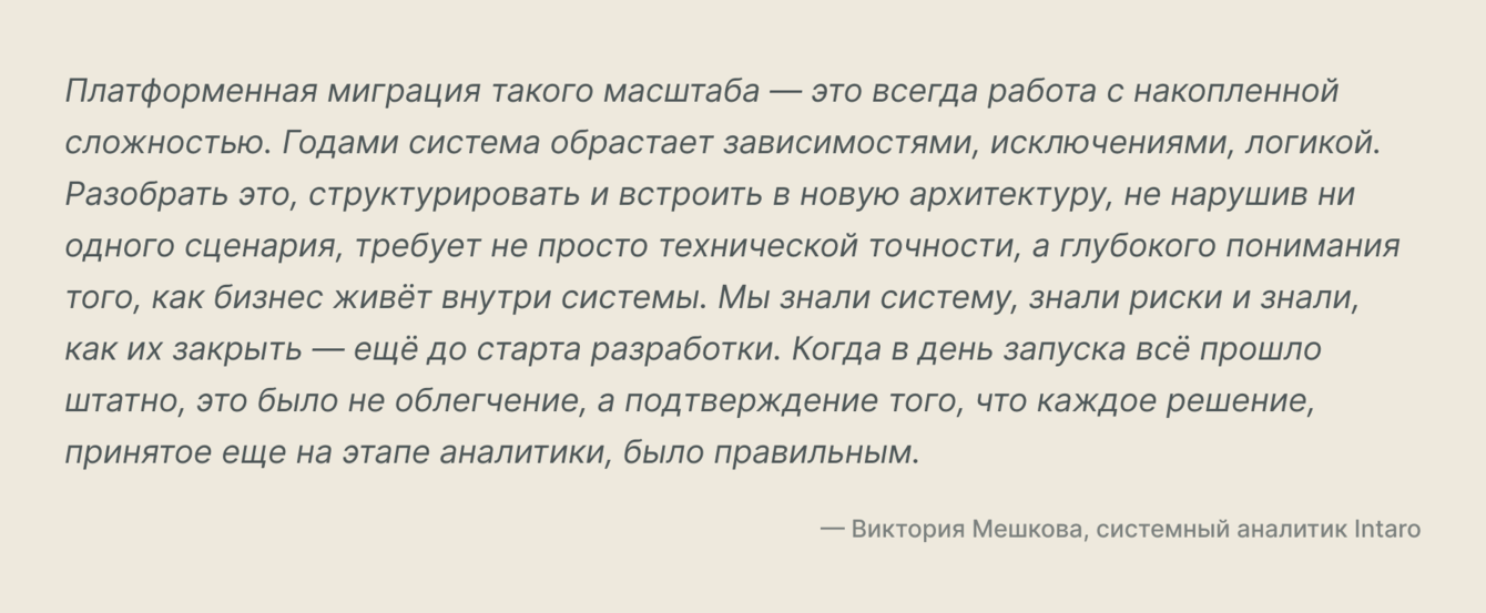 К моменту миграции мы глубоко понимали бизнес-логику клиента, знали узкие места системы и могли проактивно предлагать решения — не как внешний подрядчик, а как часть команды продукта.