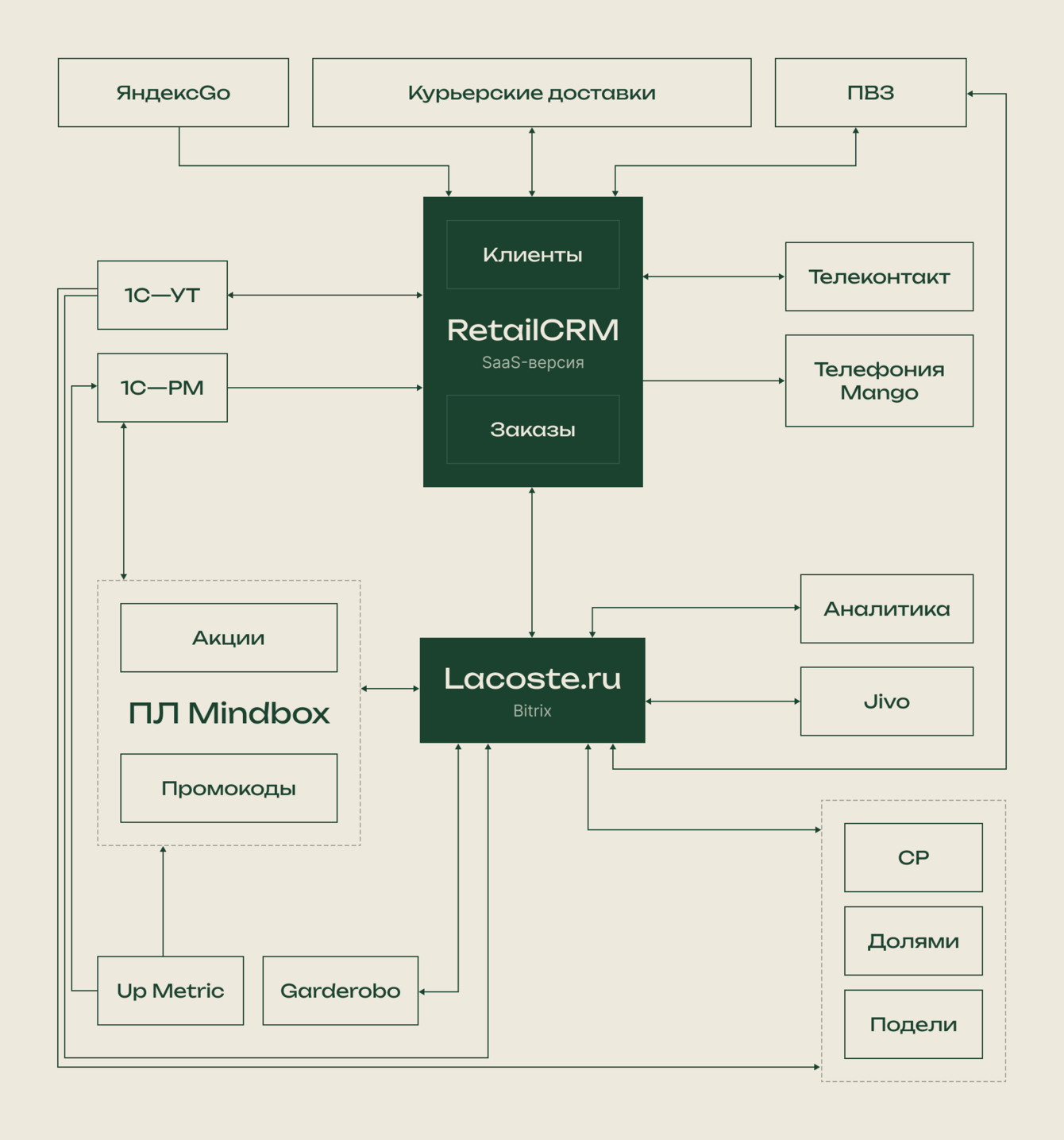 Масштаб задачи становится понятнее, когда видишь, что именно нужно было перенести. За годы развития платформы сложился насыщенный интеграционный контур: CRM, CDP, системы доставки, платежи, телефония, аналитика, чат-поддержка, товарные рекомендации.