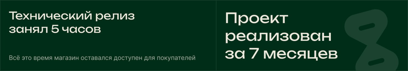 Миграция выполнена одномоментно — без этапа функционирования старого и нового сайтов. Стандартный подход в таких проектах — запустить новую версию параллельно и постепенно переключать трафик. Мы от него отказались осознанно: поддержка двух версий в системе такой сложности создала бы риски рассинхронизации данных, конфликтов авторизации, ошибок в программе лояльности и невозможность гарантировать консистентность данных клиента в двух параллельных средах.