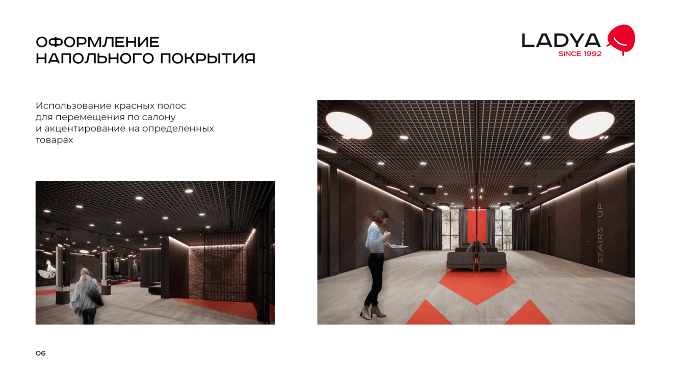 Концепт оформления напольного покрытия включает описание подсказок на красной путеводной линии.