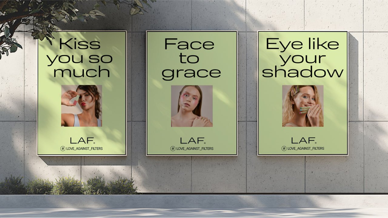 Для этого мы провели тесты, а также исследовали имеющуюся у бренда аудиторию. Так мы пришли к инсайту о том, что выбор косметики сегодня — это не просто выбор красивой упаковки и подходящего тона помады, но и философии, селебрити и трендов. Клиент пришел к нам с имеющимся названием LAF, которое не имело никакой смысловой нагрузки. Мы подарили новое значение этой аббревиатуре, фраза Love Against Filters (Любовь Против Фильтров) стала своеобразным манифестом бренда и задала дерзкую, игривую тональность языка в системе сопроводительных копирайтов, уникальных для каждого SKU в линейке.