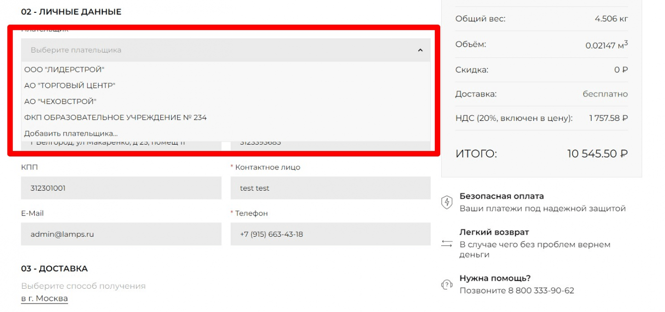 Дополнительно внедрен функционал сохранения адресов доставки. Реализовано по аналогии с плательщиками. Функционал позволяет сохранять адреса доставки и контактные данные лица, принимающего заказ, для ускорения процесса оформления заказа постоянными клиентами.