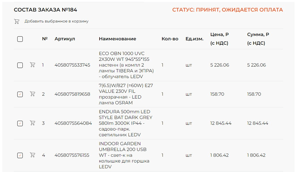 Функционал повтора заказа. Тут мы решили отойти от стандартных возможностей Битрикса, которые позволяют полностью скопировать ранее сделанный заказ. Вместо этого добавили напротив отдельных товаров чек-боксы и кнопку “Добавить выбранное в корзину”