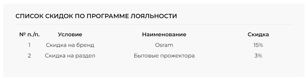 Программа лояльности для оптовиков работает на основе highload блока, в котором описываются условия предоставляемой скидки для пользователя. На основе этих же условий строятся указания к каталогу на пересчет цен. В визуальном плане, чтобы пользователь всегда был в курсе на какую группу товаров ему предоставлены особые скидки, в отдельную вкладку личного кабинета выводим таблицу.