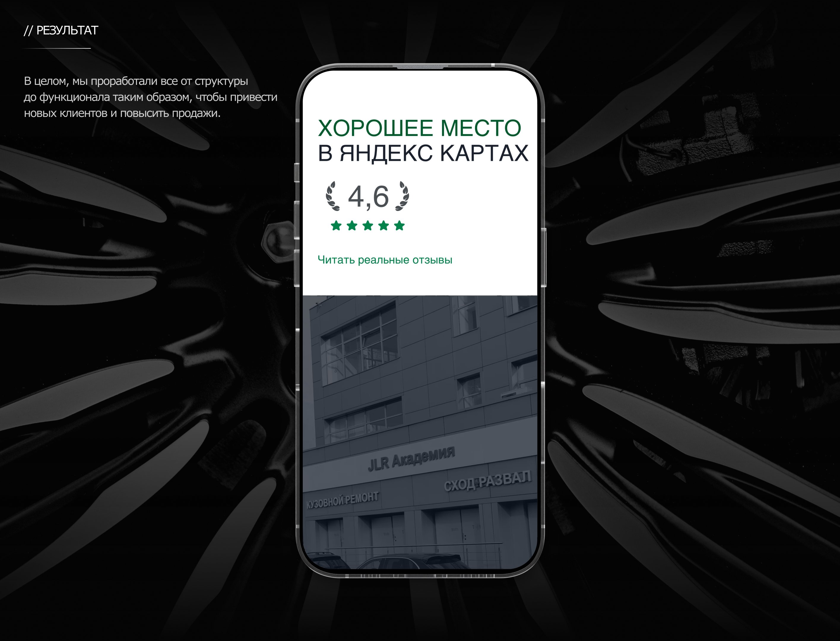 Лендинг-страница для сервиса по ремонту Land Rover стала эффективным инструментом для привлечения клиентов. Лаконичный дизайн, понятный контент и удобная форма заявки повысили конверсию и упростили взаимодействие с пользователями. Сайт способствовал увеличению числа заявок и укреплению имиджа сервиса как профессионального и надежного партнёра для владельцев Land Rover.