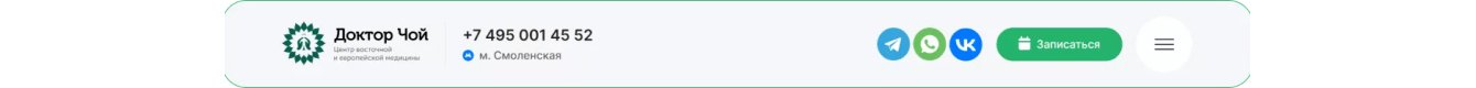 В шапке веб-страницы показаны логотип компании, кликабельный номер телефона, ссылки на социальные сети, кнопка записи на прием и гамбургер-меню.