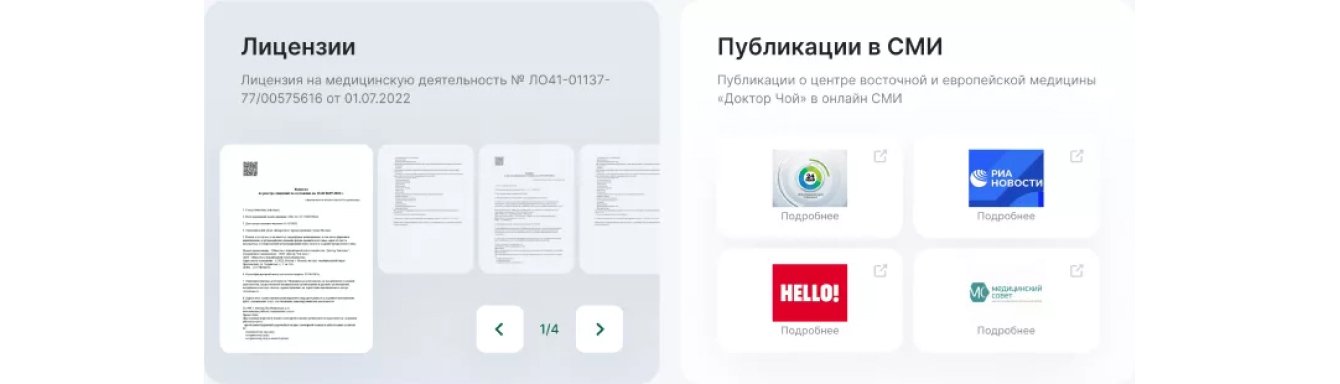 Чтобы подтвердить репутацию бренда, мы добавили модули с лицензиями и публикациями в СМИ.