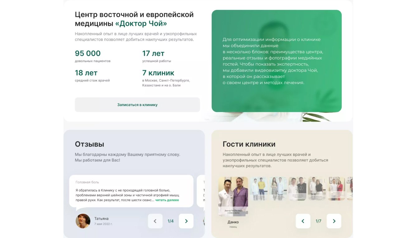 ● Структурирование информации, чтобы пользователи могли понять преимущества метода и оценить экспертность врачей.