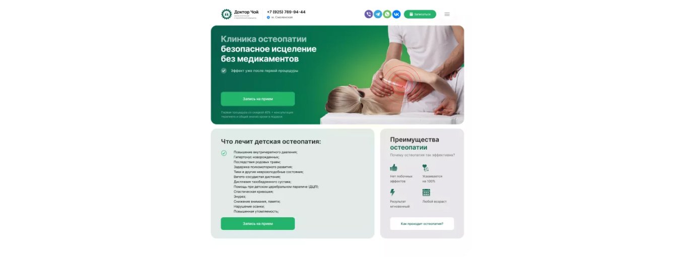 На многостраничном сайте клиники представлен широкий спектр услуг, но клиент выделил наиболее популярные: остеопатия и иглорефлексотерапия.
