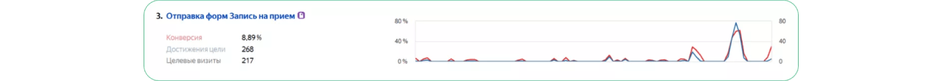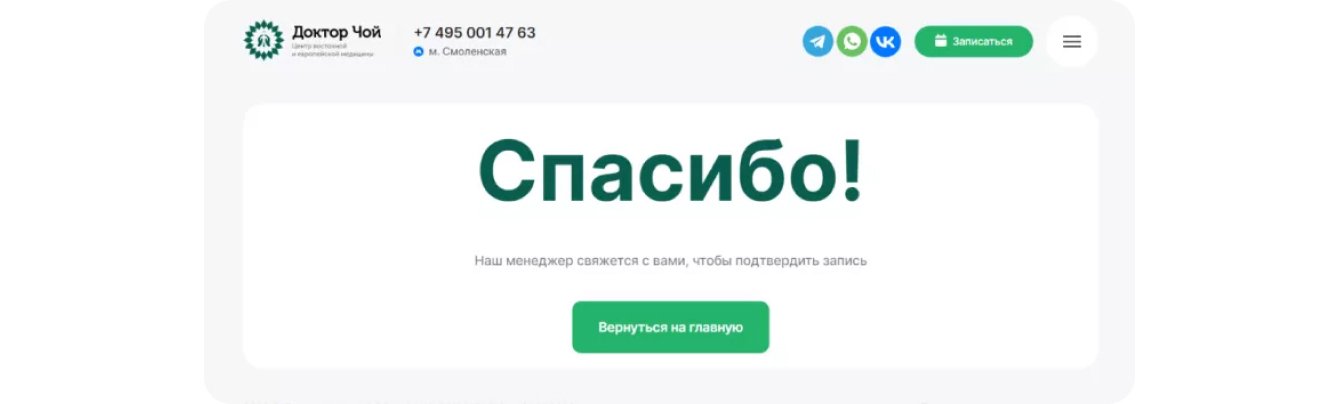 После того как клиент отправляет свои контактные данные, он переходит на страницу «Спасибо». Именно на нее мы настроили цель в «Яндекс.Метрике», чтобы отслеживать количество конверсий.