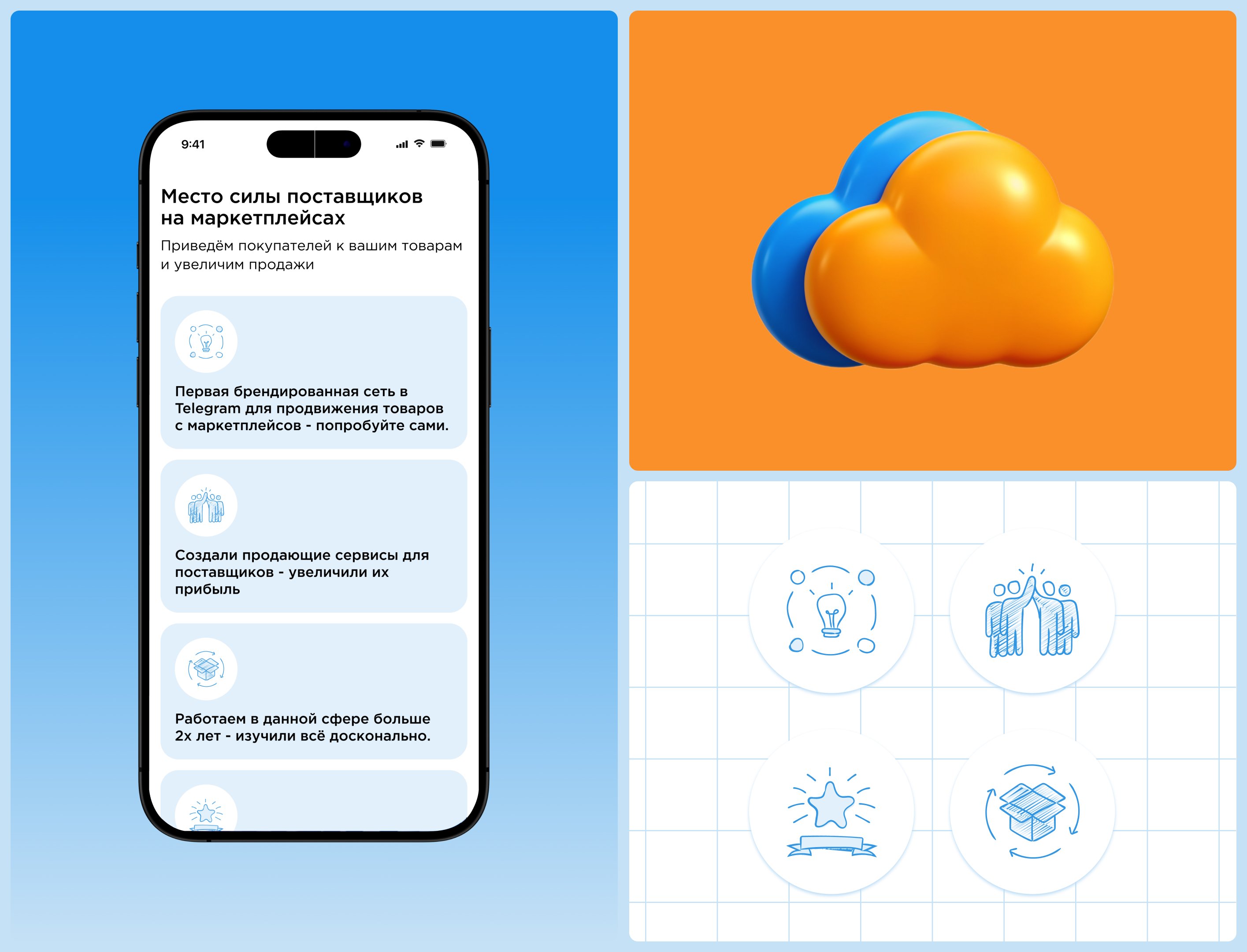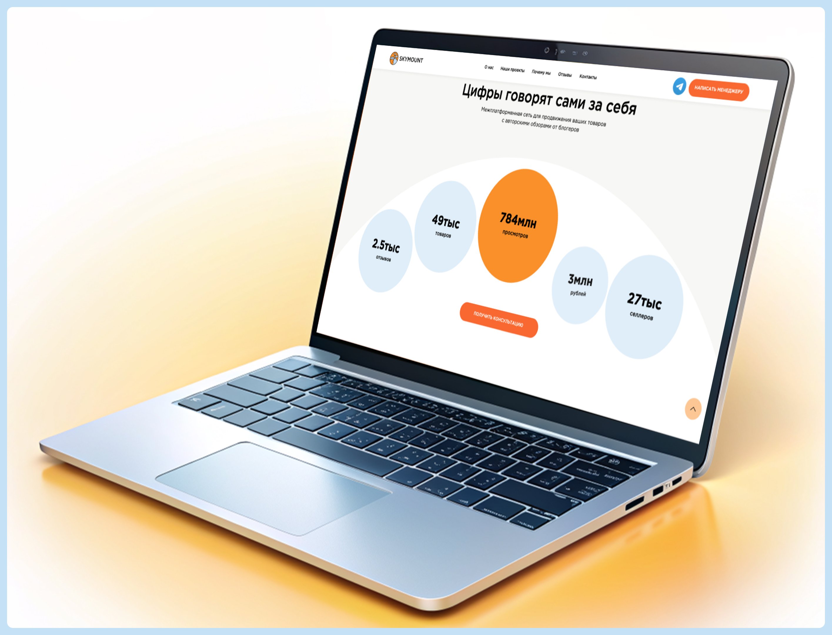 Разработан удобный интерфейс с акцентом на ключевые услуги: продвижение товаров через социальные сети, индивидуальный подбор площадок, готовые решения для продавцов.