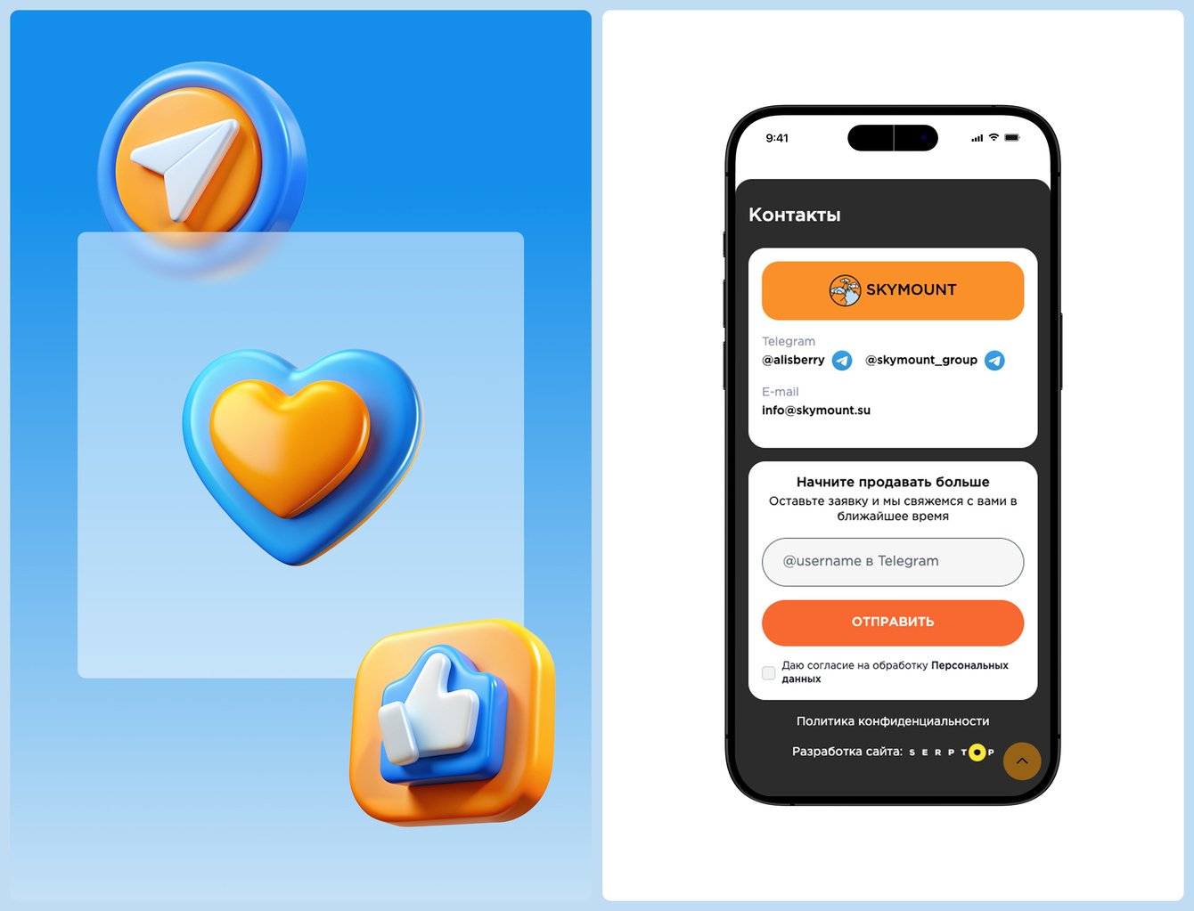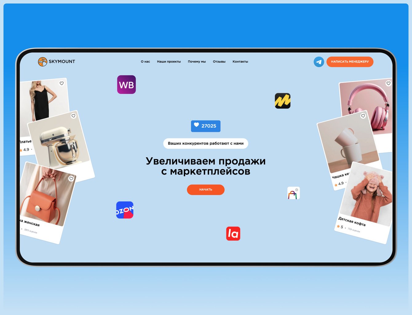 Разработать лендинг-страницу для компании «Skymount», специализирующейся на продвижении товаров через социальные сети. Сайт должен был представить услуги компании, её преимущества и обеспечить удобство взаимодействия для потенциальных клиентов.